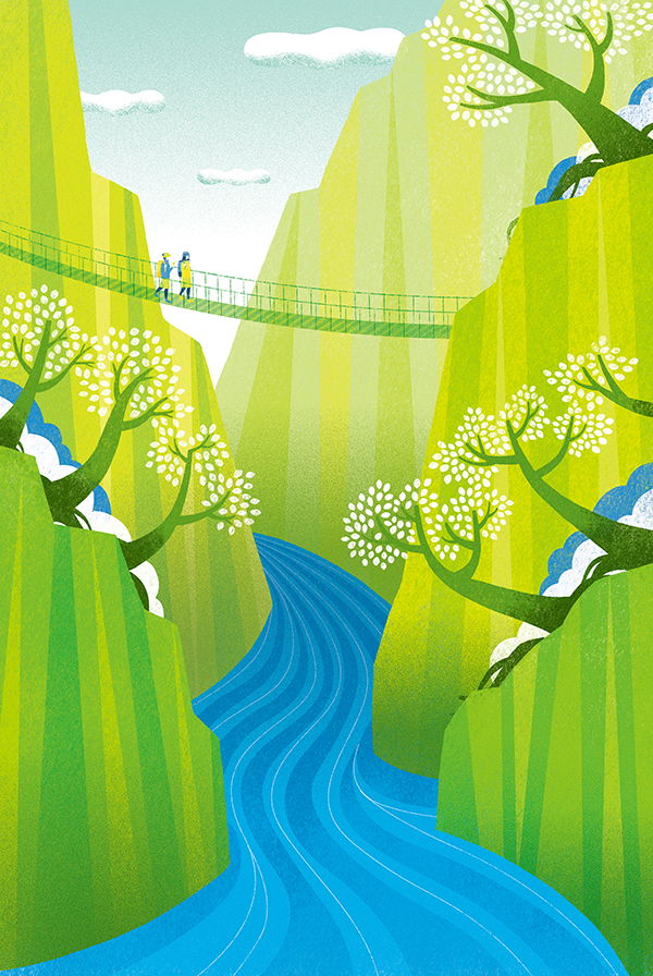 新緑の谷でハイキング