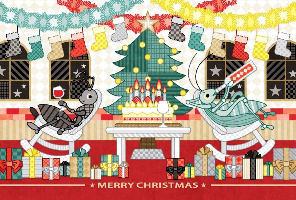 クリスマスカード クリスマスパーティー クリスマスツリー プレゼント デザイン メルヘン キリギリス 蟻 昆虫 メリークリスマス Christmas card Christmas party Christmas tree presents design marchen grasshopper ant insect Merry_Christmas