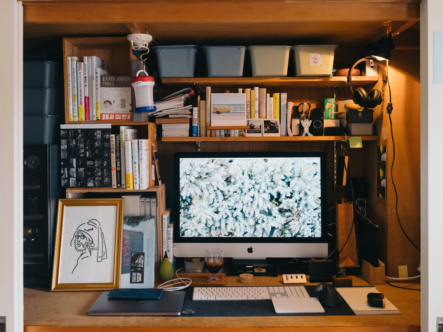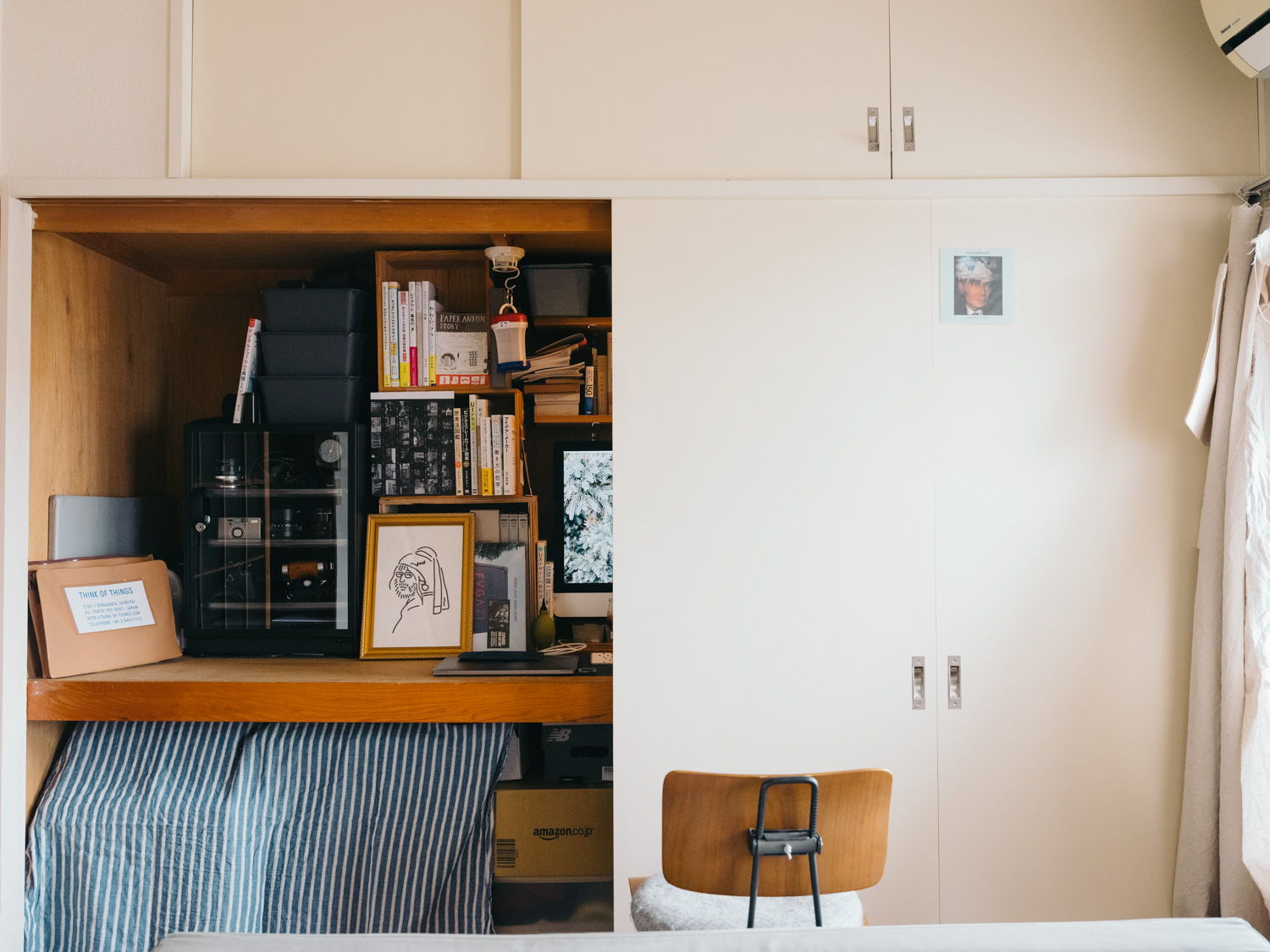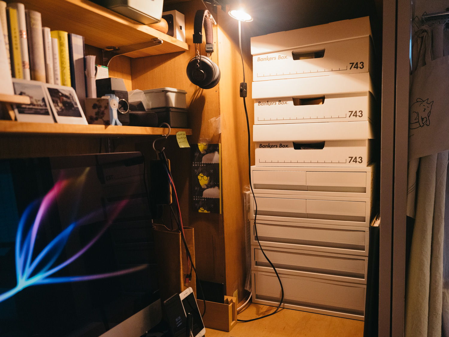 デスクにはPCの他、自作の棚や収納、カメラ機材などを置いています。デスクの下段は通常通り押入れとして使用。電源は最寄りのコンセントから、延長コードで引っ張ってきています。ライトはクリップライト(コンセントから電源供給)。