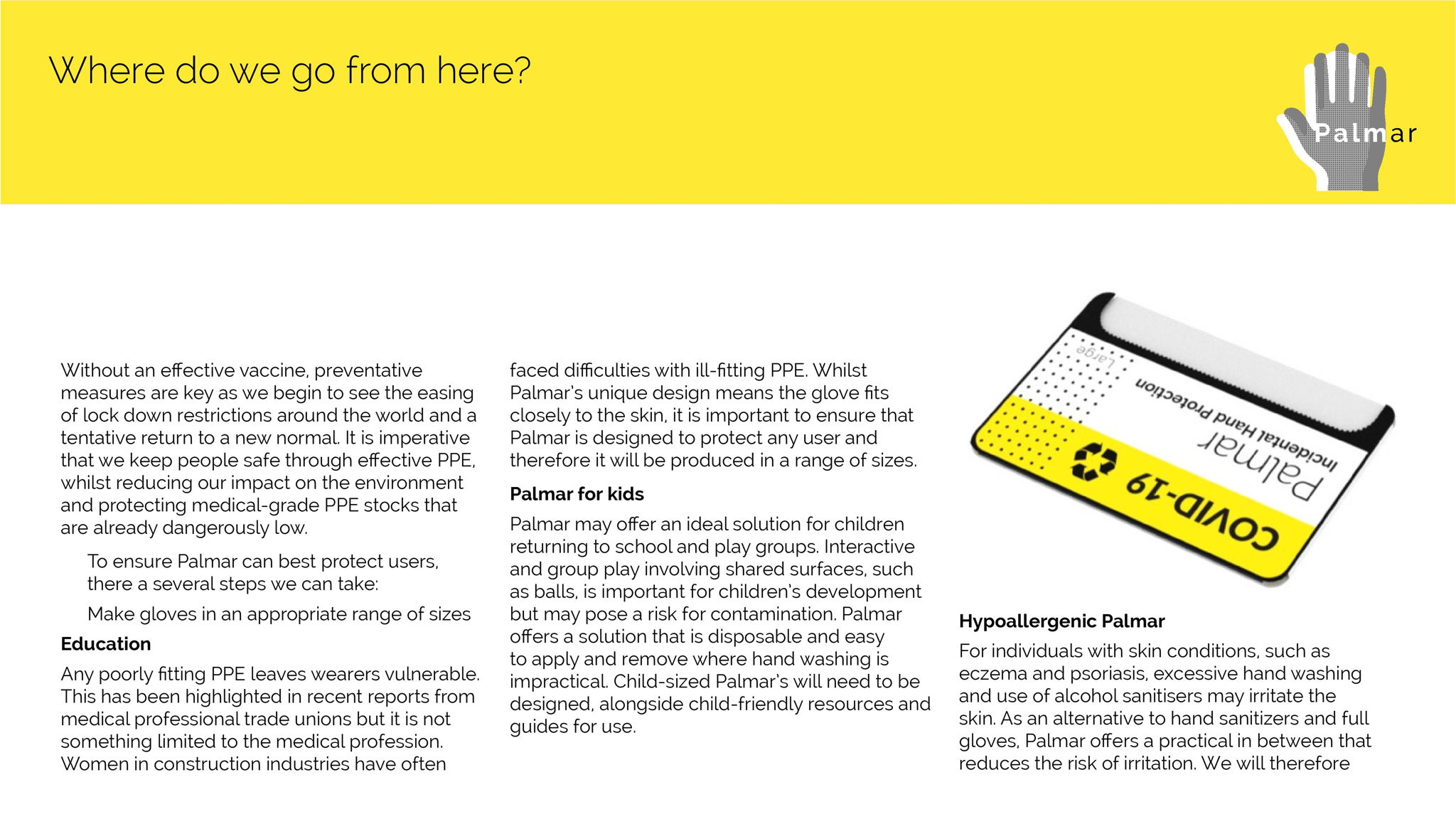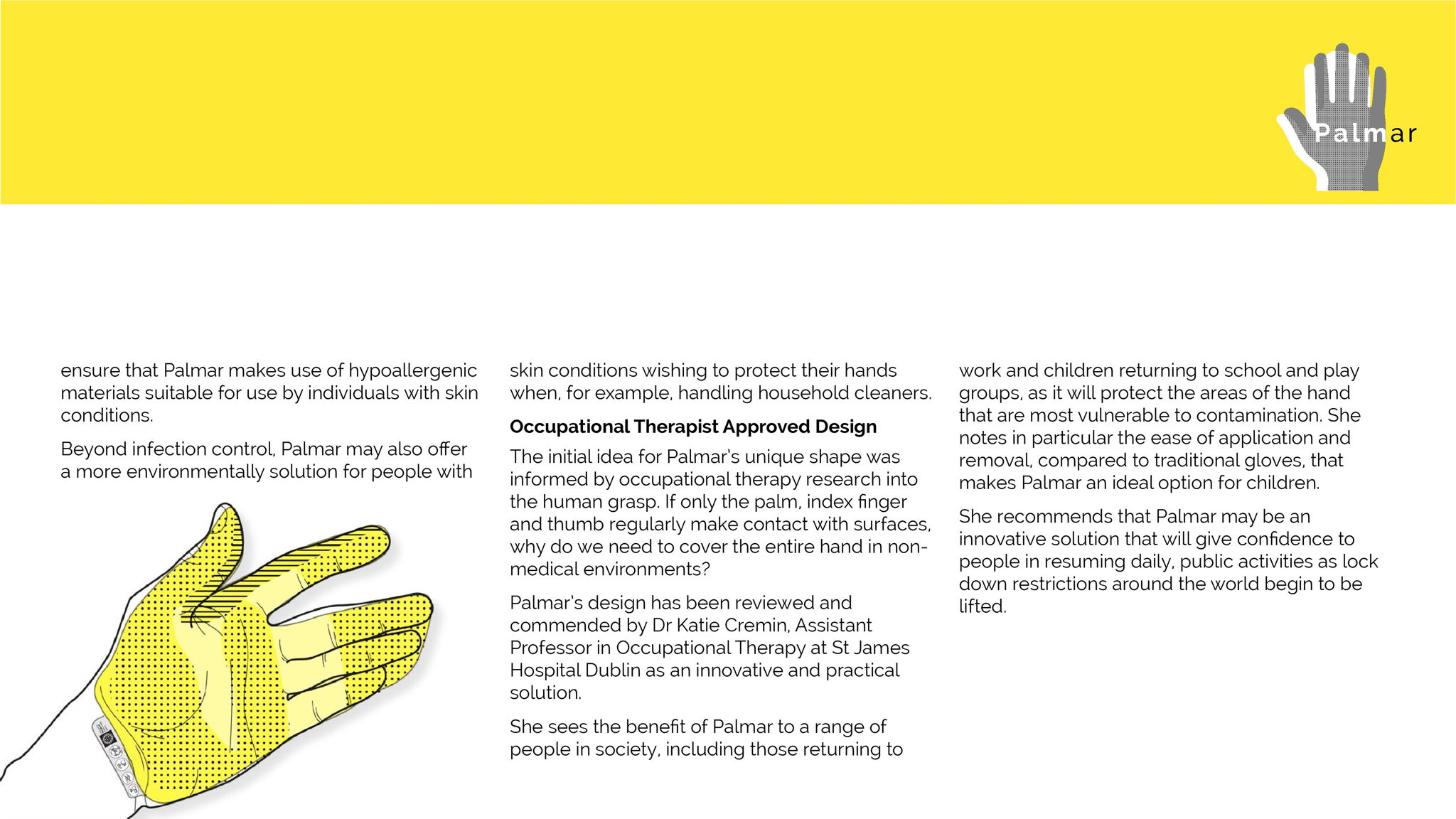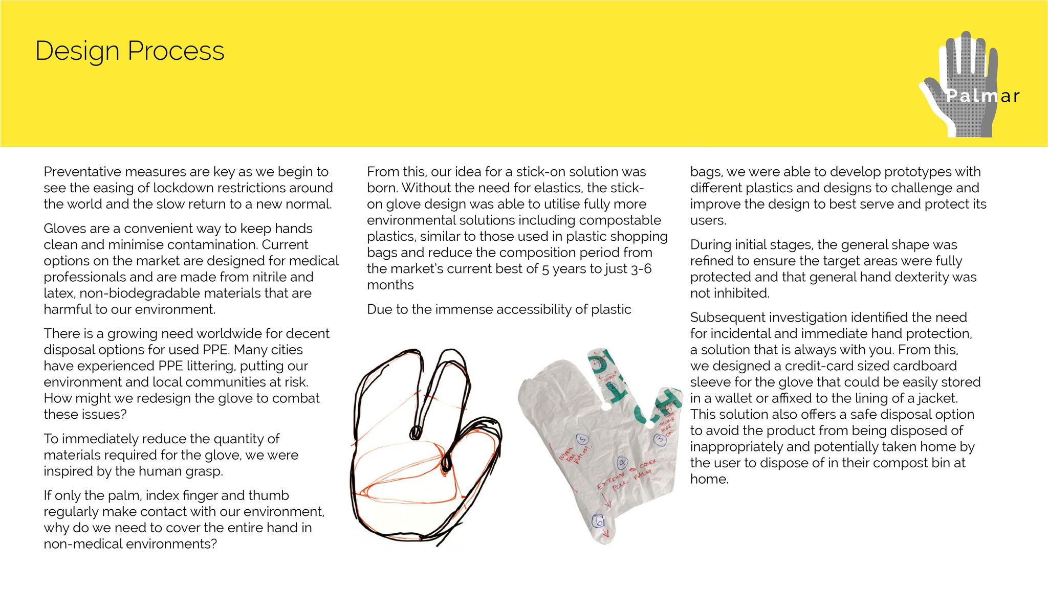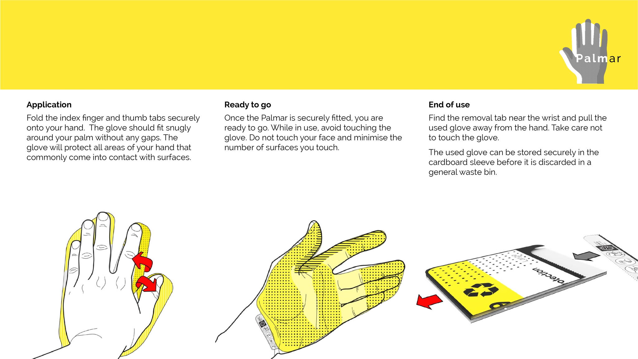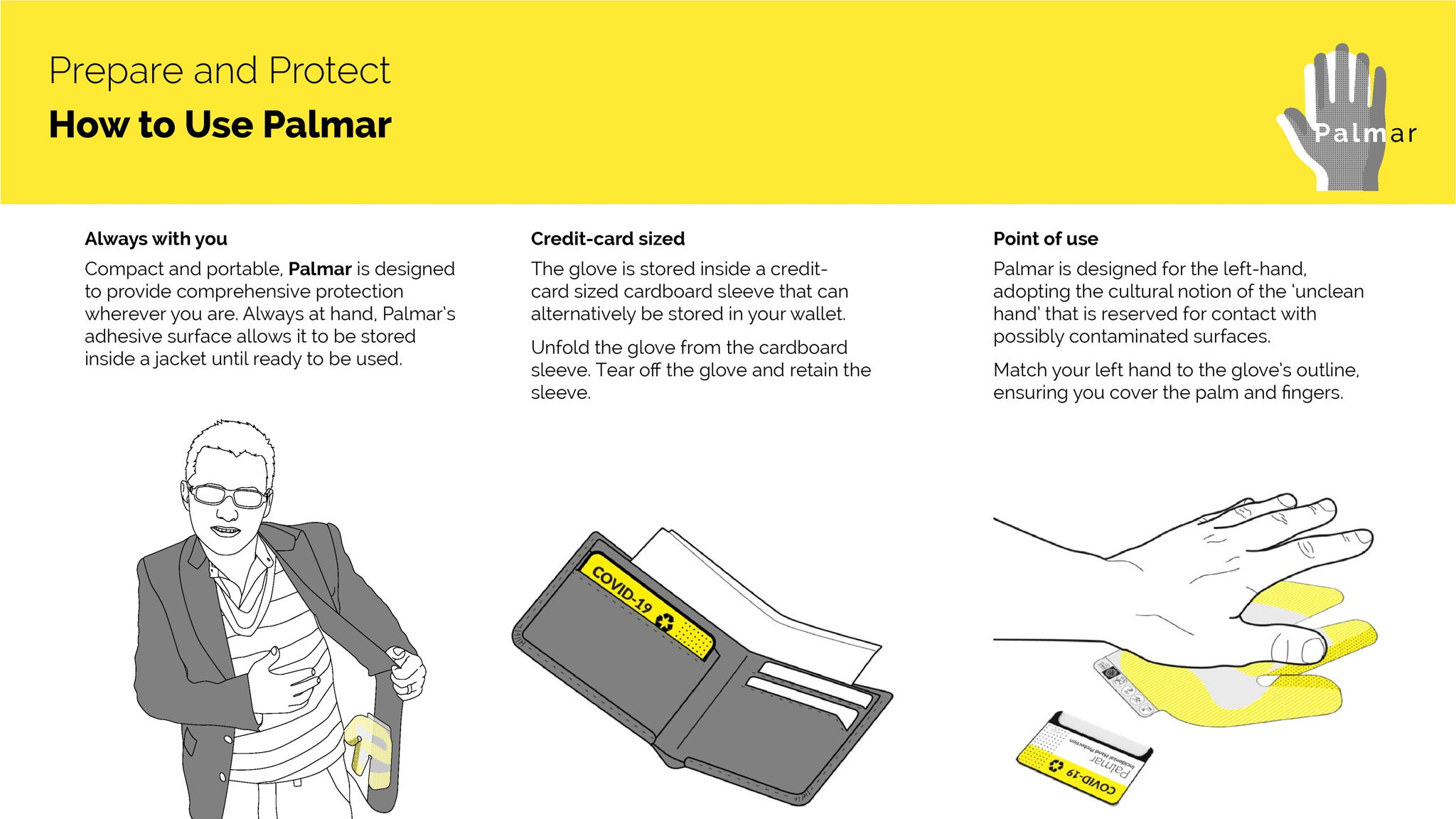 Many individuals are anxious to leave the house and to resume daily activities in fear of contracting the virus or spreading it to loved ones. Palmar extends the notion of home, reinterpreting 'home' as a feeling and place of safety, not only something conflated with or related to the house. The glove provides a physical barrier between yourself, your 'home' or safe space and the outside world. It is not designed to replace hand washing nor to encourage wearers to be less vigilant.