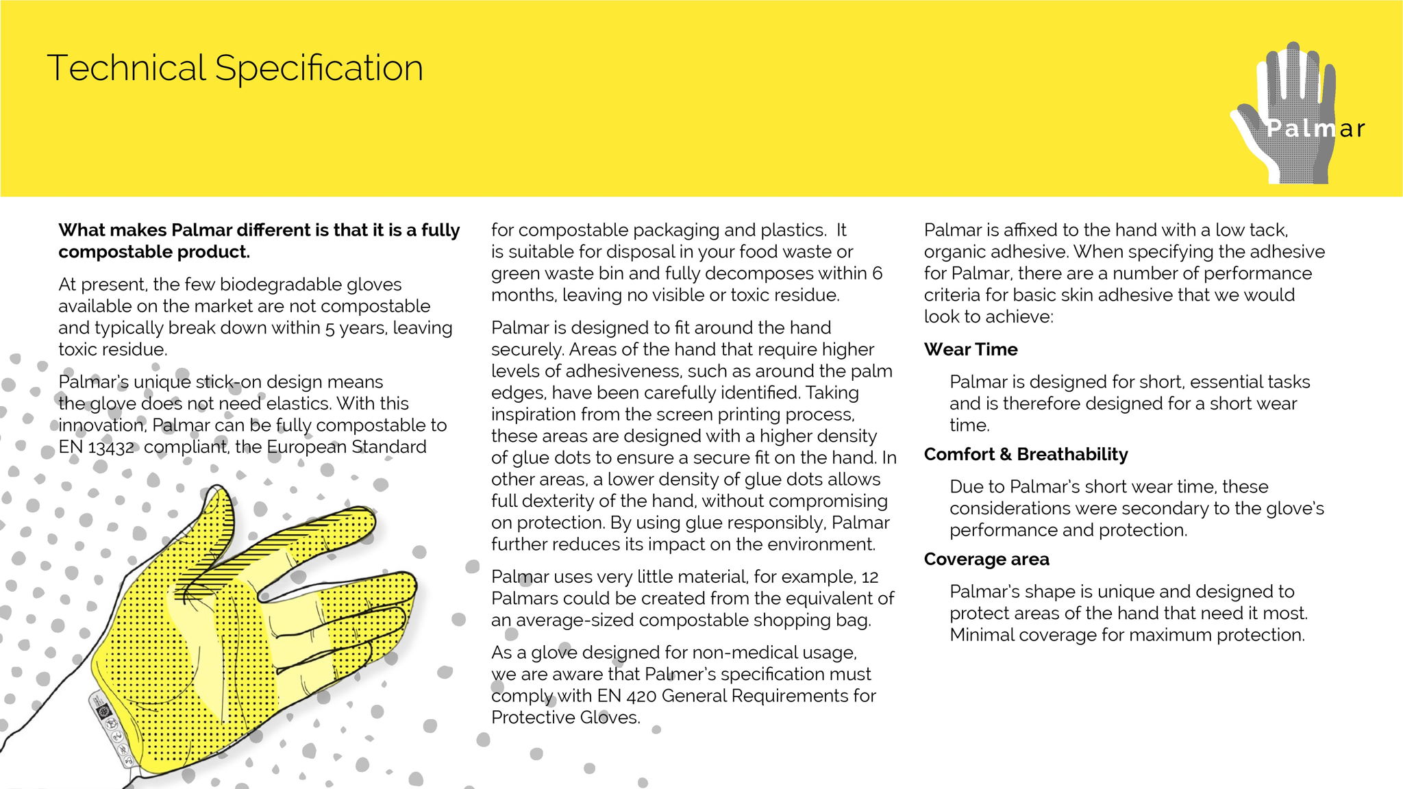 Palmar is a sustainable, fully compostable alternative to non-biodegradable latex gloves to protect people as they return to workplaces and offices around the world. Palmar's cardboard sleeve doubles as a convenient disposal option to discourage irresponsible littering.
