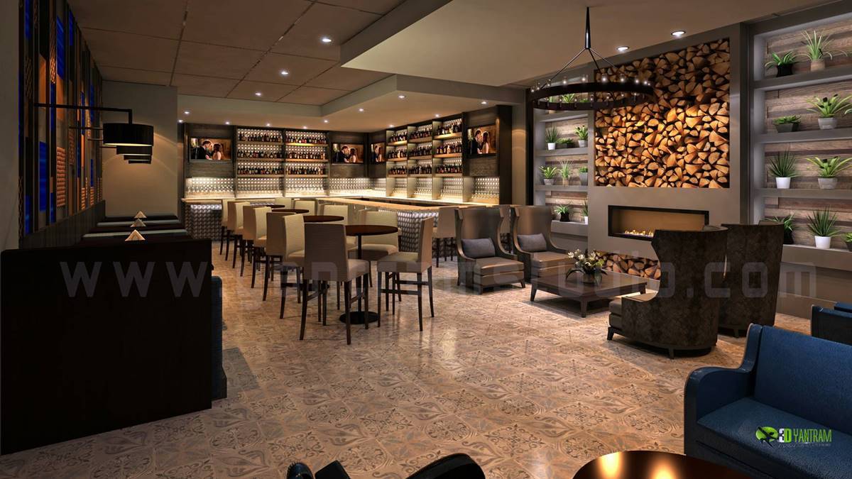 The gorgeous colour palette gives the space a stylish bold moody feel because of the contrast with the modern seating and arrangement , Ideas of 3D Interior bar view are developed by 3D Yantram Architectural Design Studio. We has greatest team for Night view 3D Bar Interior Design for Modern Style, 3D Interior Designers, interior design firms, architectural interior rendering.