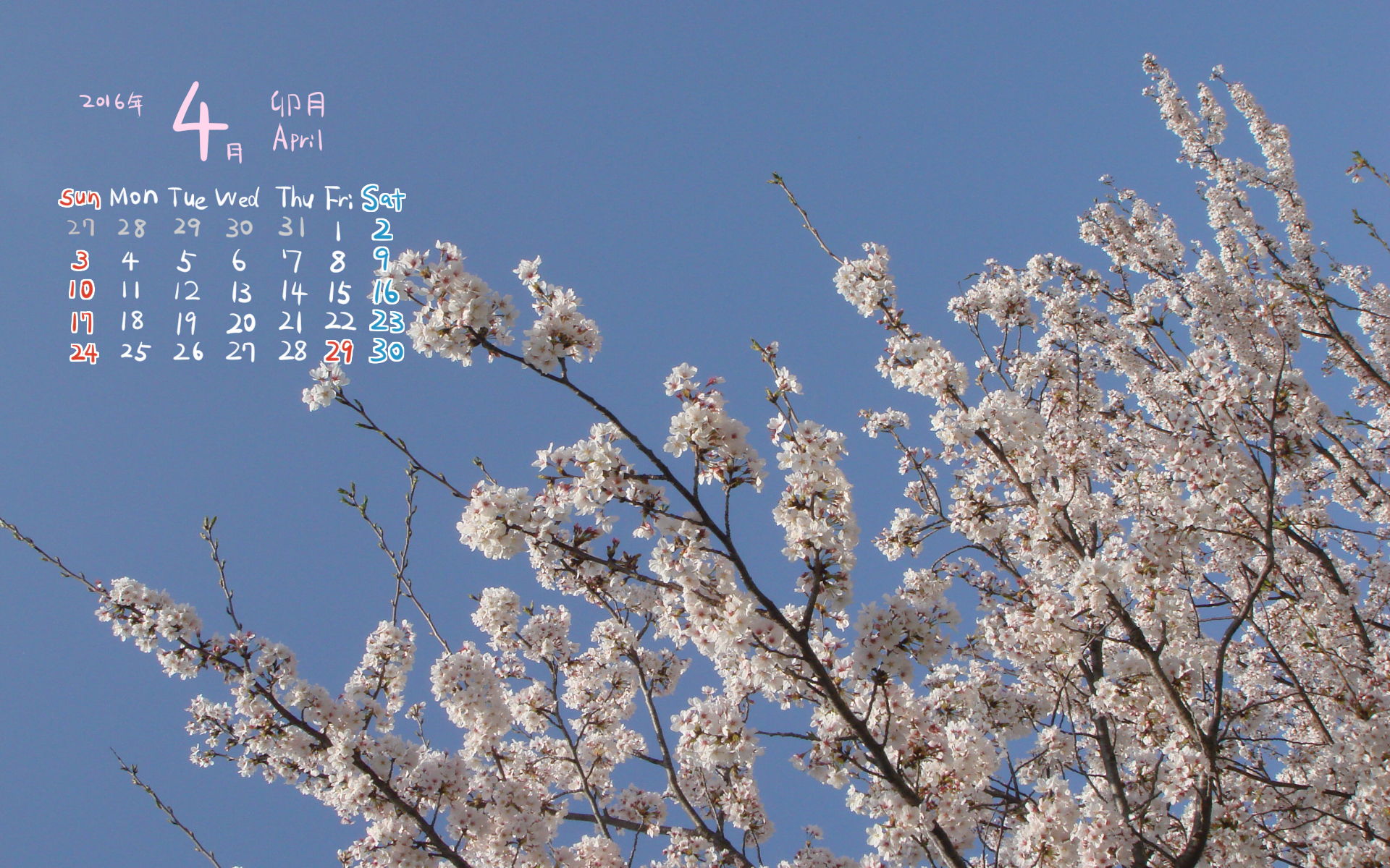 2016年4月PC壁紙(カレンダー付き)1(1920×1200)です。