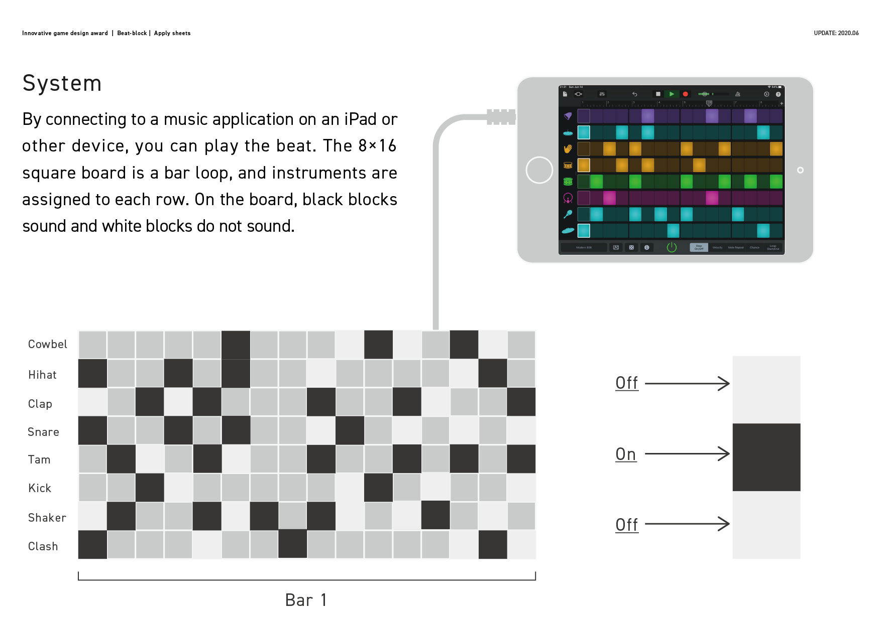 3. By connecting to a music application on an iPad or other device, you can play the beat. The 8×16 square board is a bar loop, and instruments are assigned to each row. On the board, black blocks sound and white blocks do not sound.