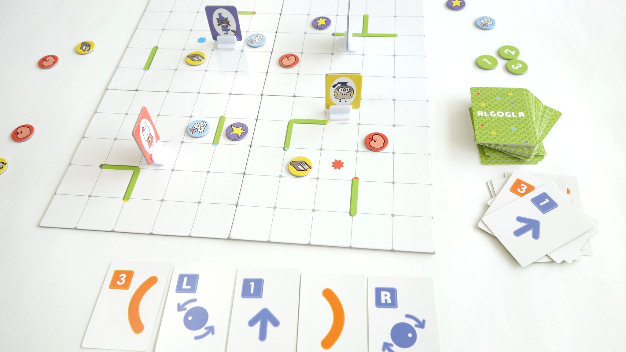 ALGOGLA(アルゴグラ)は動きを指示する「コードカード」を並べ、ボード上のコマ(スプライト)を動かし、チップをゲットするゲームです。