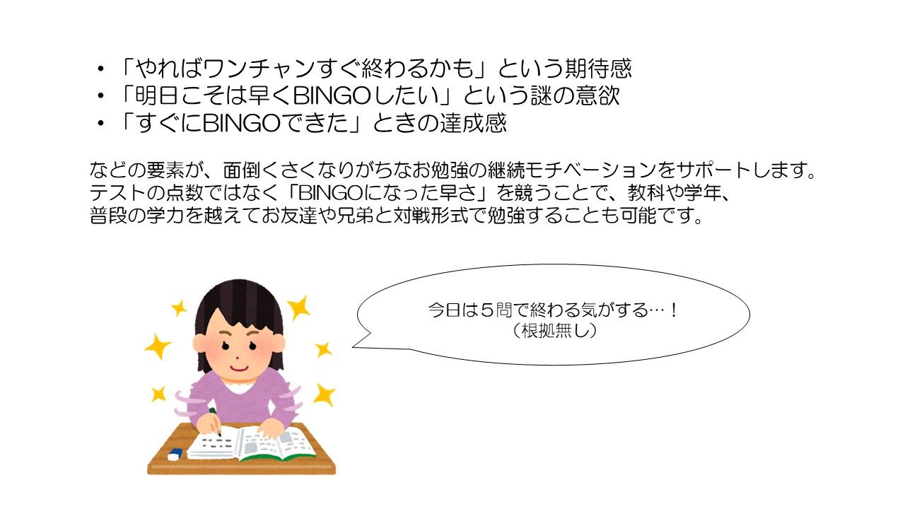 問題の難易度や強化を越えてどっちがはやくビンゴできるかといった競争の遊びなども取り入れることが可能。