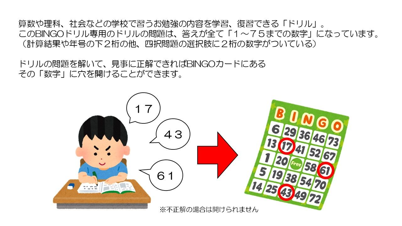 ただドリルを解いて、答えを確認し、正解していればビンゴカードに穴を開けるだけ。
