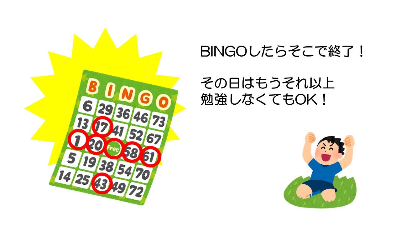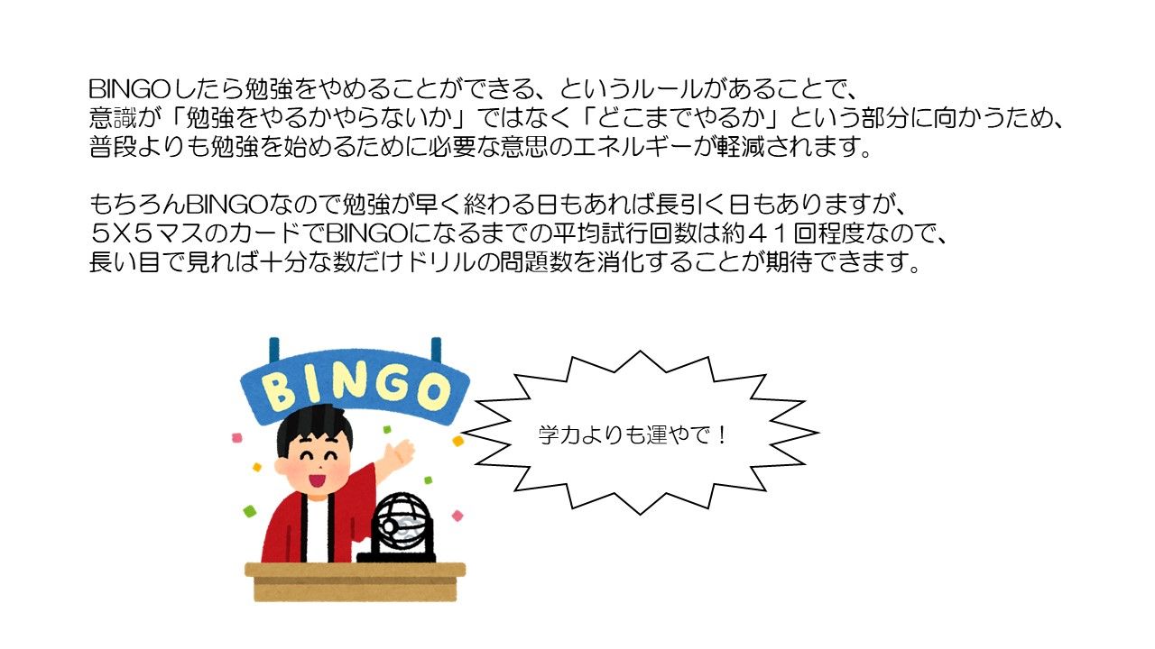 答えの数字でビンゴしたらそこで勉強を終了してもOKな学習ドリル。