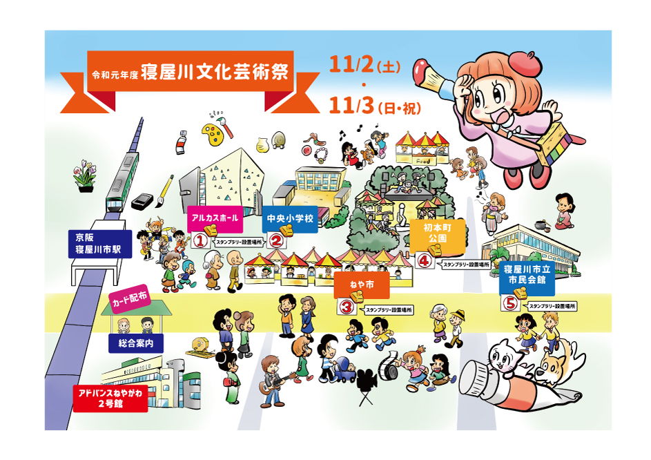 寝屋川市の文化芸術のイベントのリーフレットの表紙、イラストマップ、のぼりをデザインしました。