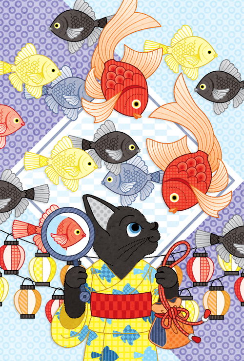 春夏秋冬四季の猫のイラスト集「夏祭り猫と金魚」(リメイク)