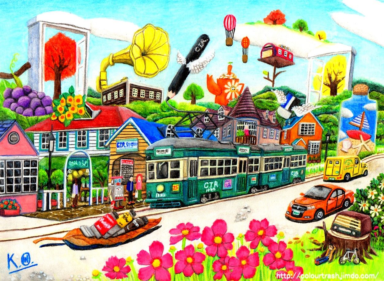 画用紙にA4(210×297)程の範囲内(※完成後切取)に水彩色鉛筆で描いたもので9月4日(日)に本郷台駅前広場にて開催された「本郷台駅前まつり2016」にて展示したもの。