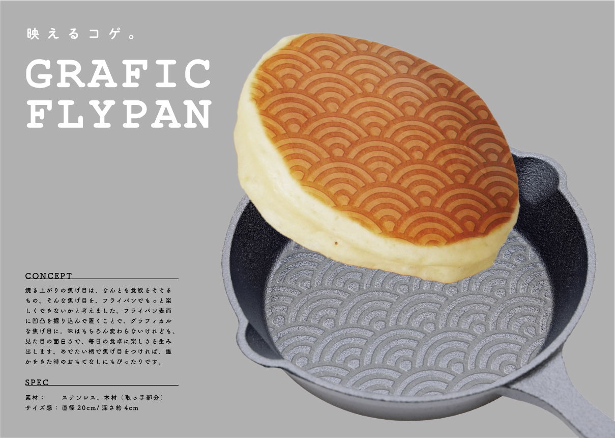 焼き上がりの焦げ目は、なんとも食欲をそそるもの。そんな焦げ目を、フライパンでもっと楽しくできないかと考えました。フライパン表面に凹凸を掘り込んで置くことで、グラフィカルな焦げ目に。味はもちろん変わらないけれども、見た目の面白さで、毎日の食卓に楽しさを生み出します。めでたい柄で焦げ目をつければ、誰かをきた時のおもてなしにもぴったりです。