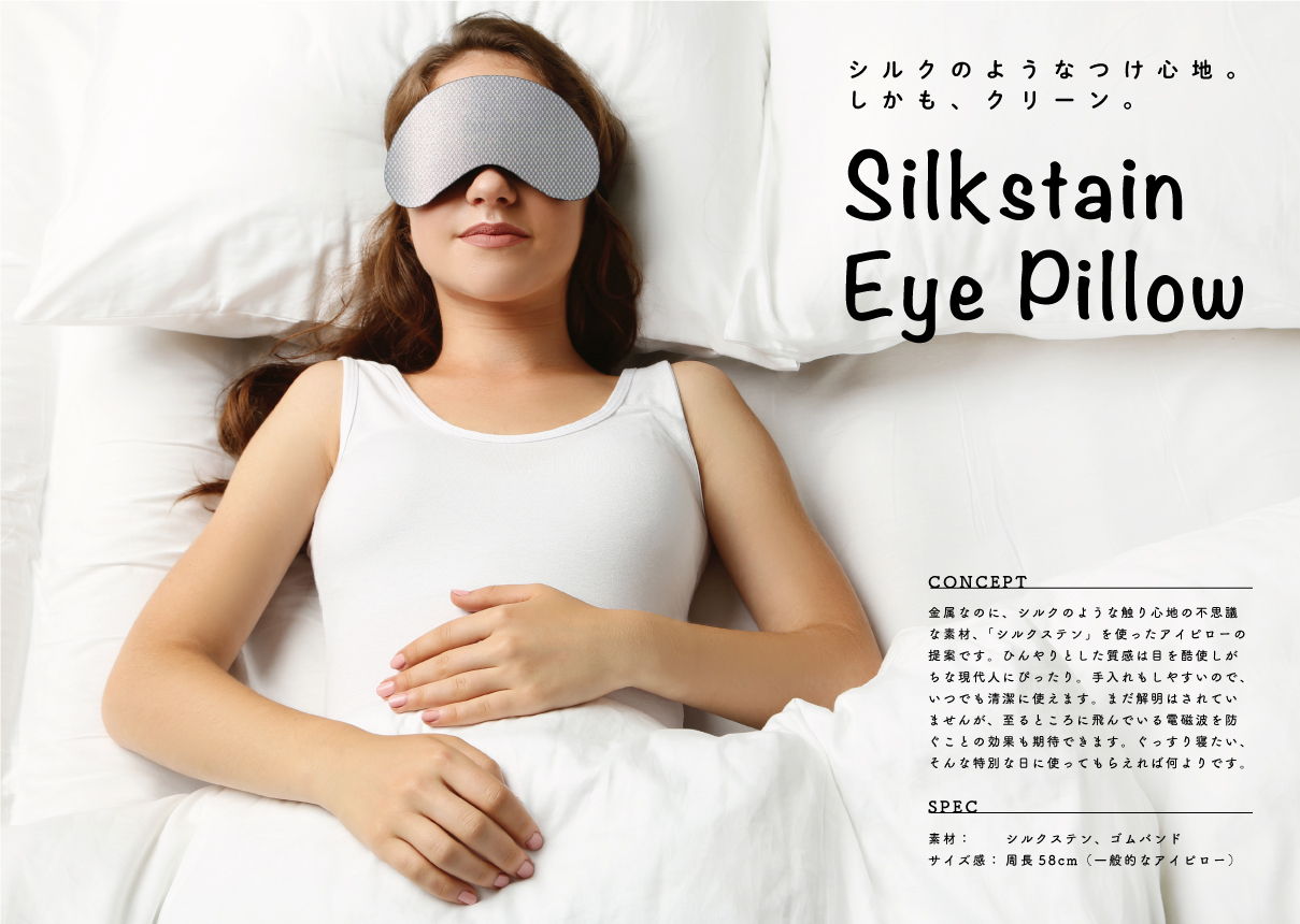 金属なのに、シルクのような触り心地の不思議な素材、「シルクステン」を使ったアイピローの提案です。ひんやりとした質感は目を酷使しがちな現代人にぴったり。手入れもしやすいので、いつでも清潔に使えます。まだ解明はされていませんが、至るところに飛んでいる電磁波を防ぐことの効果も期待できます。ぐっすり寝たい、そんな特別な日に使ってもらえれば何よりです。