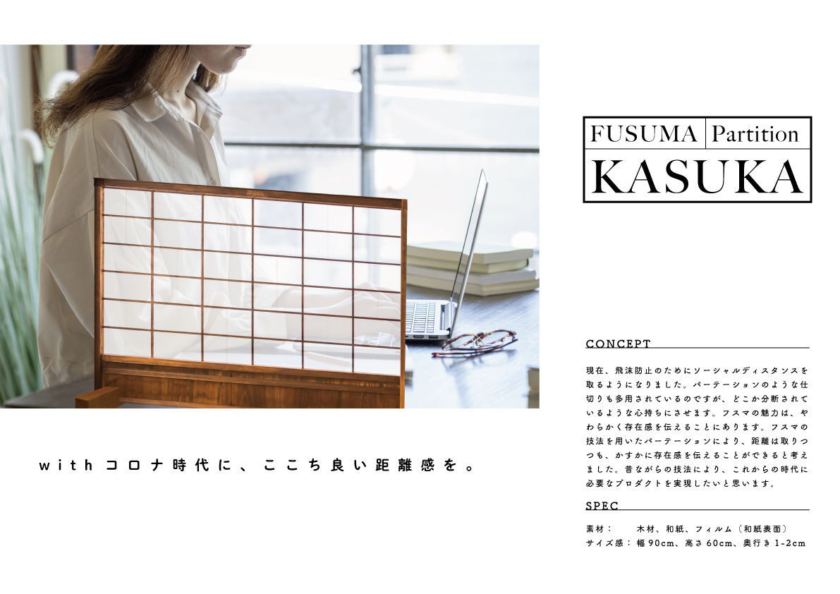 現在、飛沫防止のためにソーシャルディスタンスを取るようになりました。パーテーションのような仕切りも多用されているのですが、どこか分断されているような心持ちにさせます。フスマの魅力は、やわらかく存在感を伝えることにあります。フスマの技法を用いたパーテーションにより、距離は取りつつも、かすかに存在感を伝えることができると考えました。昔ながらの技法により、これからの時代に必要なプロダクトを実現したいと思います。