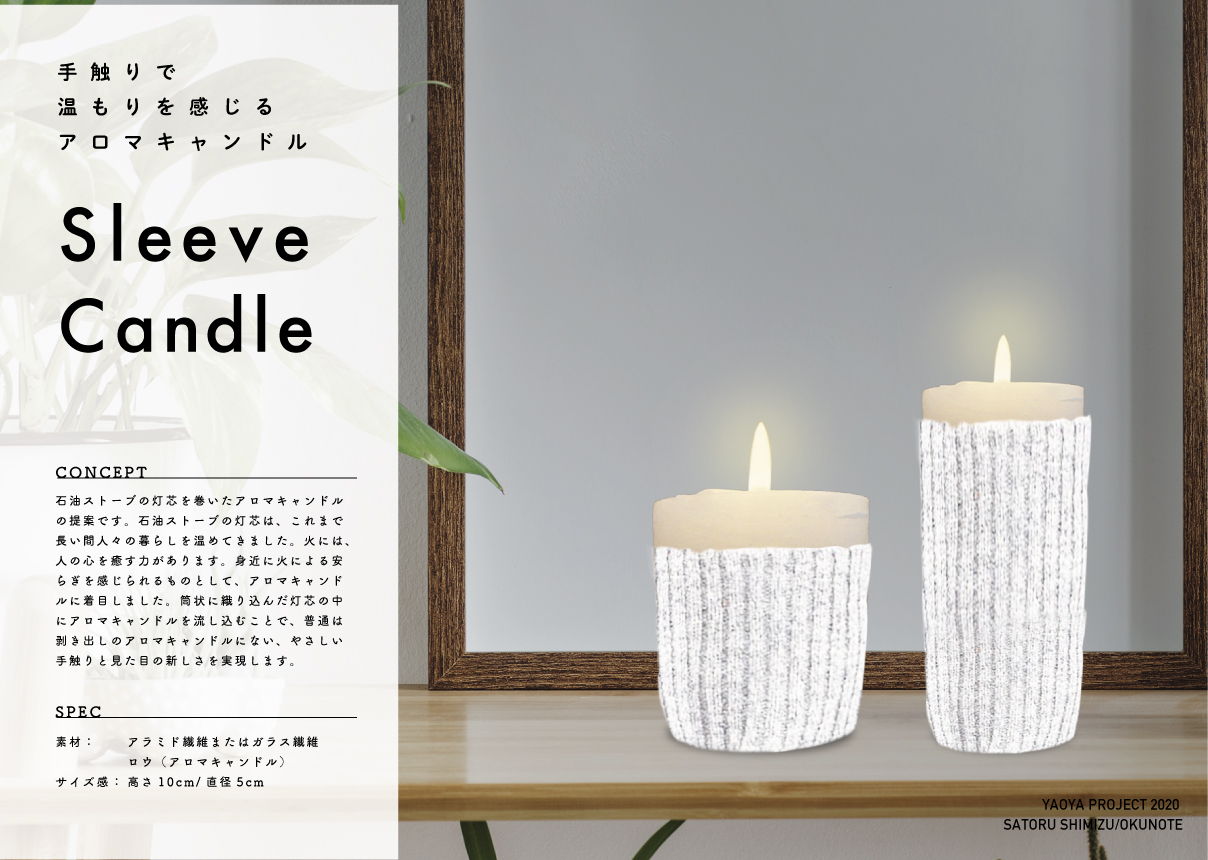 石油ストーブの灯芯を巻いたアロマキャンドルの提案です。石油ストーブの灯芯は、これまで長い間人々の暮らしを温めてきました。火には、人の心を癒す力があります。身近に火による安らぎを感じられるものとして、アロマキャンドルに着目しました。筒状に織り込んだ灯芯の中にアロマキャンドルを流し込むことで、普通は剥き出しのアロマキャンドルにない、やさしい手触りと見た目の新しさを実現します。