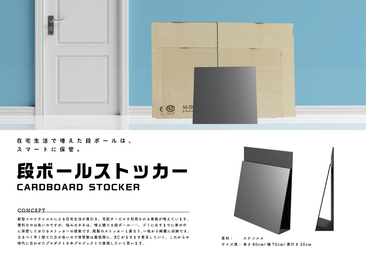 新型コロナウイルスによる在宅生活が長引き、宅配サービスを利用される家庭が増えています。便利なのは良いのですが、悩みのタネは、増え続ける段ボール……。ゴミに出すまでに家の中に保管しておけるストッカーの提案です。既製のストッカーと異なり、一枚から綺麗に収納でき、なるべく早く捨てた方が良いので保管数は最低限に。ECがますます普及していく、これからの時代に合わせたプロダクトを本プロジェクトで実現したいと思います。