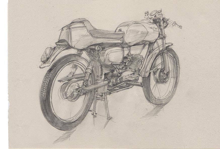 ぼくの場合。この絵ではスピードメーターから描いてそこから、その次のタンクとかシートにかかるという具合に描きます。