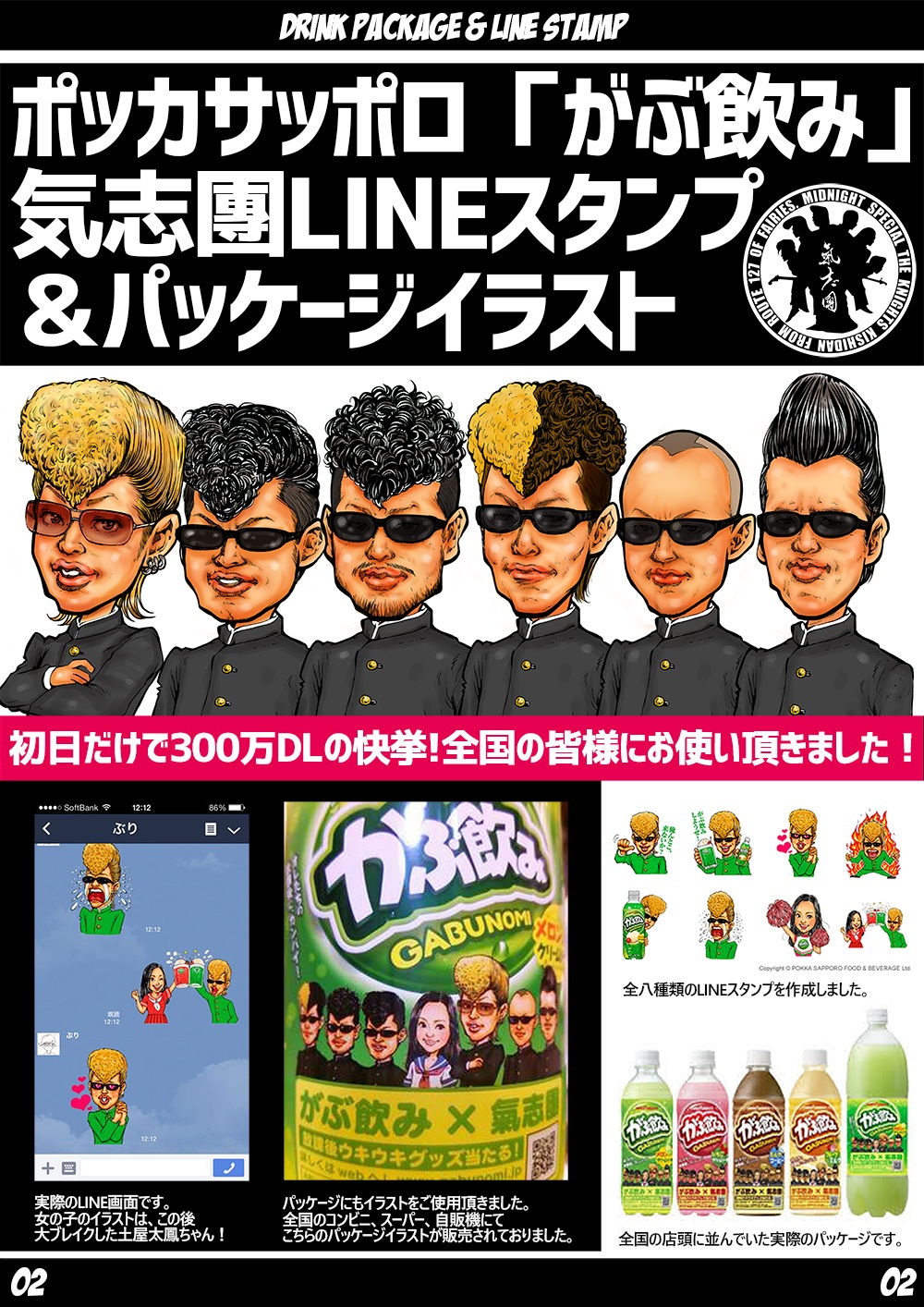2014 ポッカサッポロ「がぶ飲み」シリーズ、LINEスタンプ、商品パッケージ四種類イラスト担当。