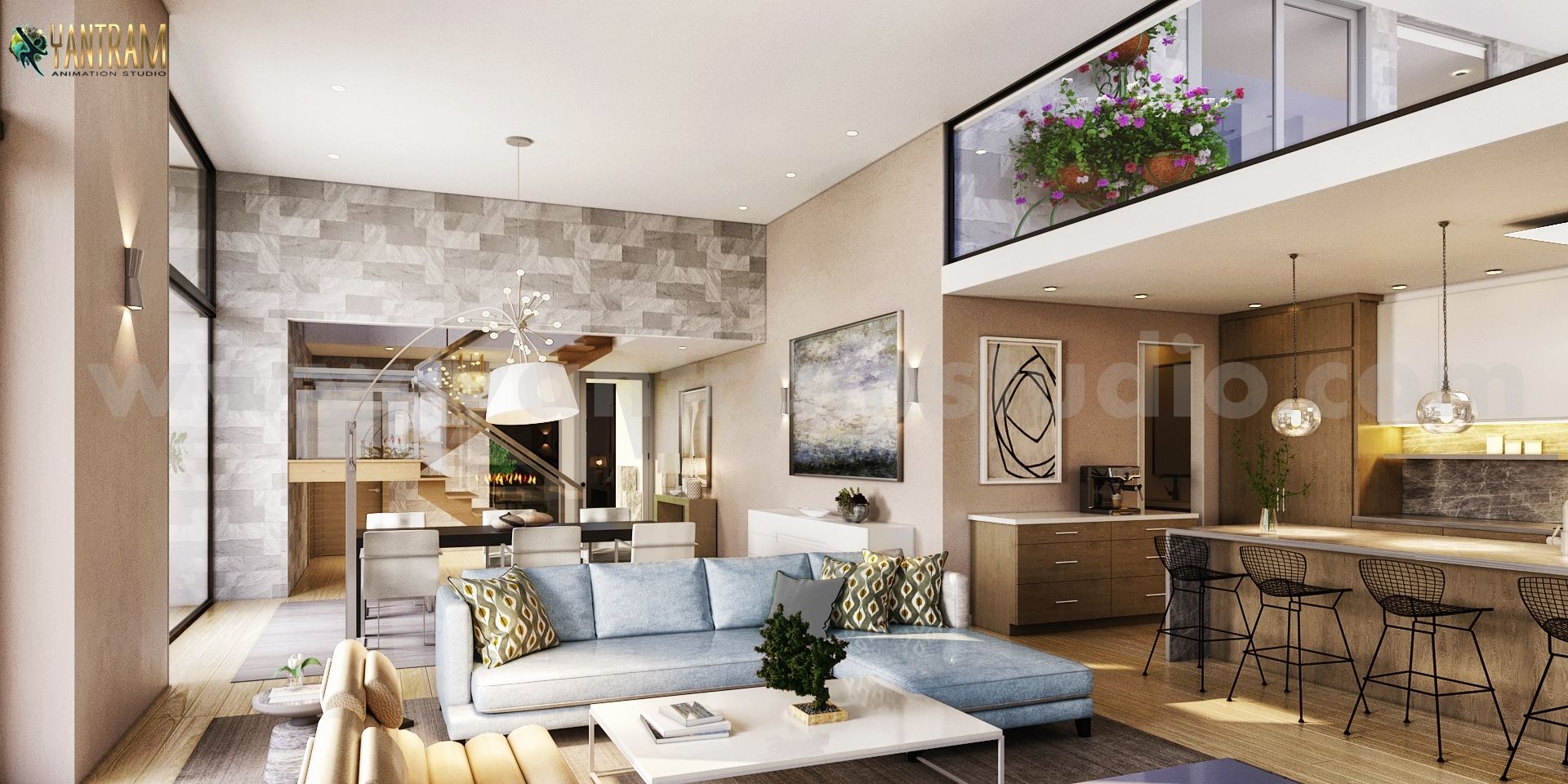 モダンで革新的な住宅用リビングエリア3Dインテリアモデリング、建築レンダリング会社、日本語-東京