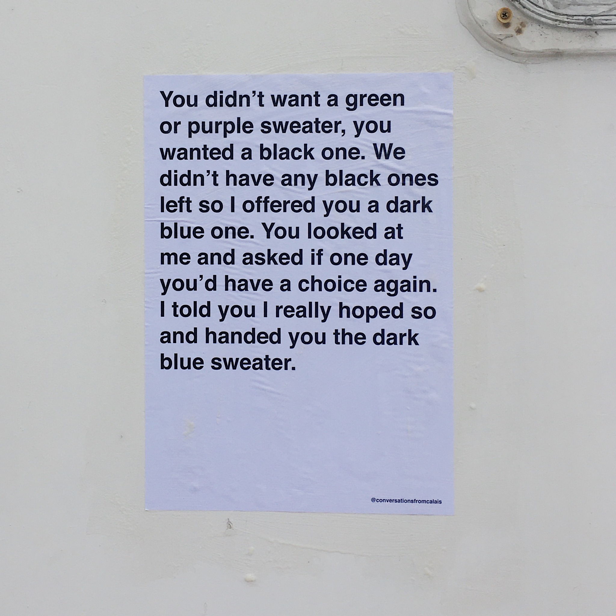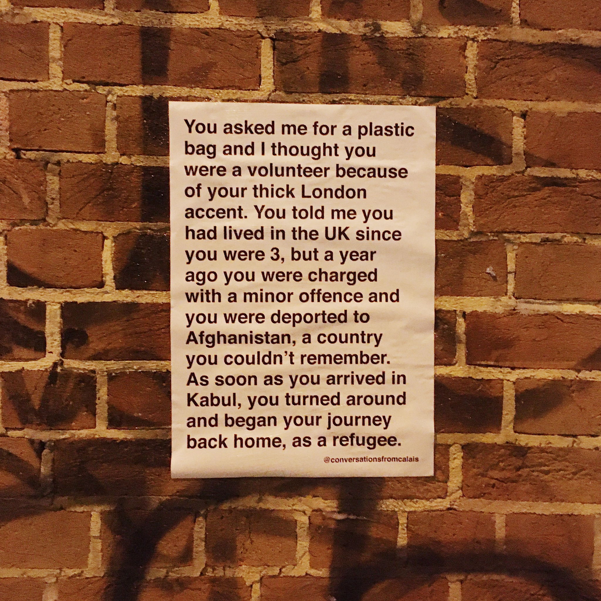 I started this project in October 2019. I had been volunteering in Calais on and off for two years now, and every time I came back, I felt the need to share what I experienced there. I wanted find a way to break away from how migrants were portrayed in mainstream media by remembering, documenting and commemorating banal but intimate and relatable conversations. I took the train down to Dover to paste up my first set of posters using home-made glue I had made that morning. These posters were based on my own personal conversations I’d had, so it felt liberating but also scary to put them up for anyone to read. I knew that once they were up in the streets, they weren’t really mine anymore. On the same day, I also created an Instagram account to create a visual archive of all the posters and reach a wider audience. I have been posting these stories since.
