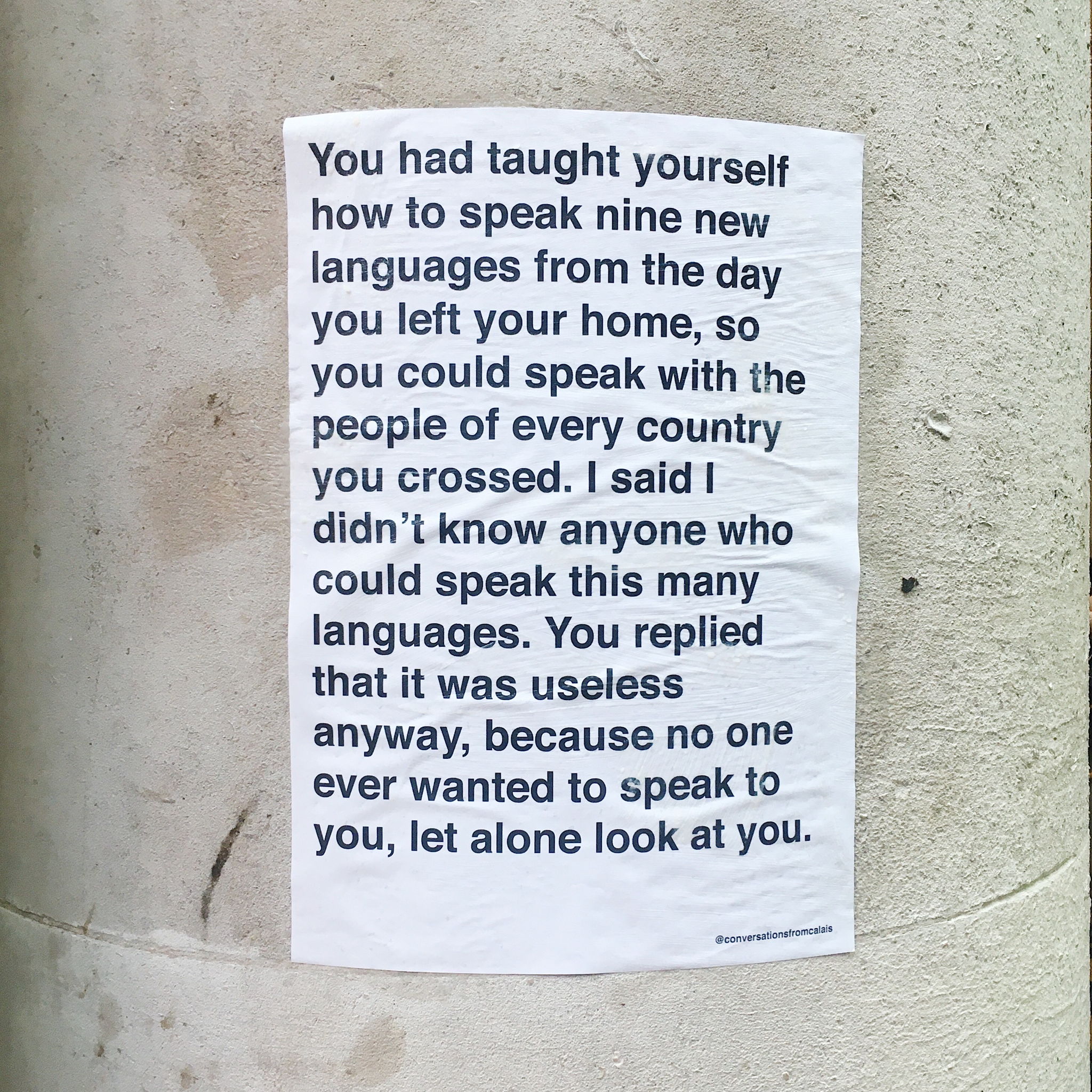 Conversations From Calais aims to re-humanise those affected by the refugee crisis by using public space to share conversations volunteers have had with migrants met in Calais. It is a way of bearing witness for the thousands of displaced people stuck in Calais and trying to reach the UK, whose voices are so often silenced or ignored. This ever-growing collection of conversations focuses on capturing the diversity of experiences and avoids creating new stereotypes of refugees as villains, heroic figures or hopeless victims. By pasting these posters on walls all around the world, we are taking over public space, commemorating these voices and inspiring social change.