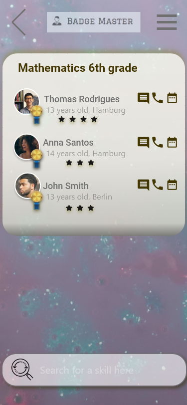 It's a an App that helps find and schedule with skilled students in order to learn about school subjects, games or any other matter. The main idea is that teachers use this tool to make student interact during classes in order to learn with each other. Hopefully students will use it after classes too.