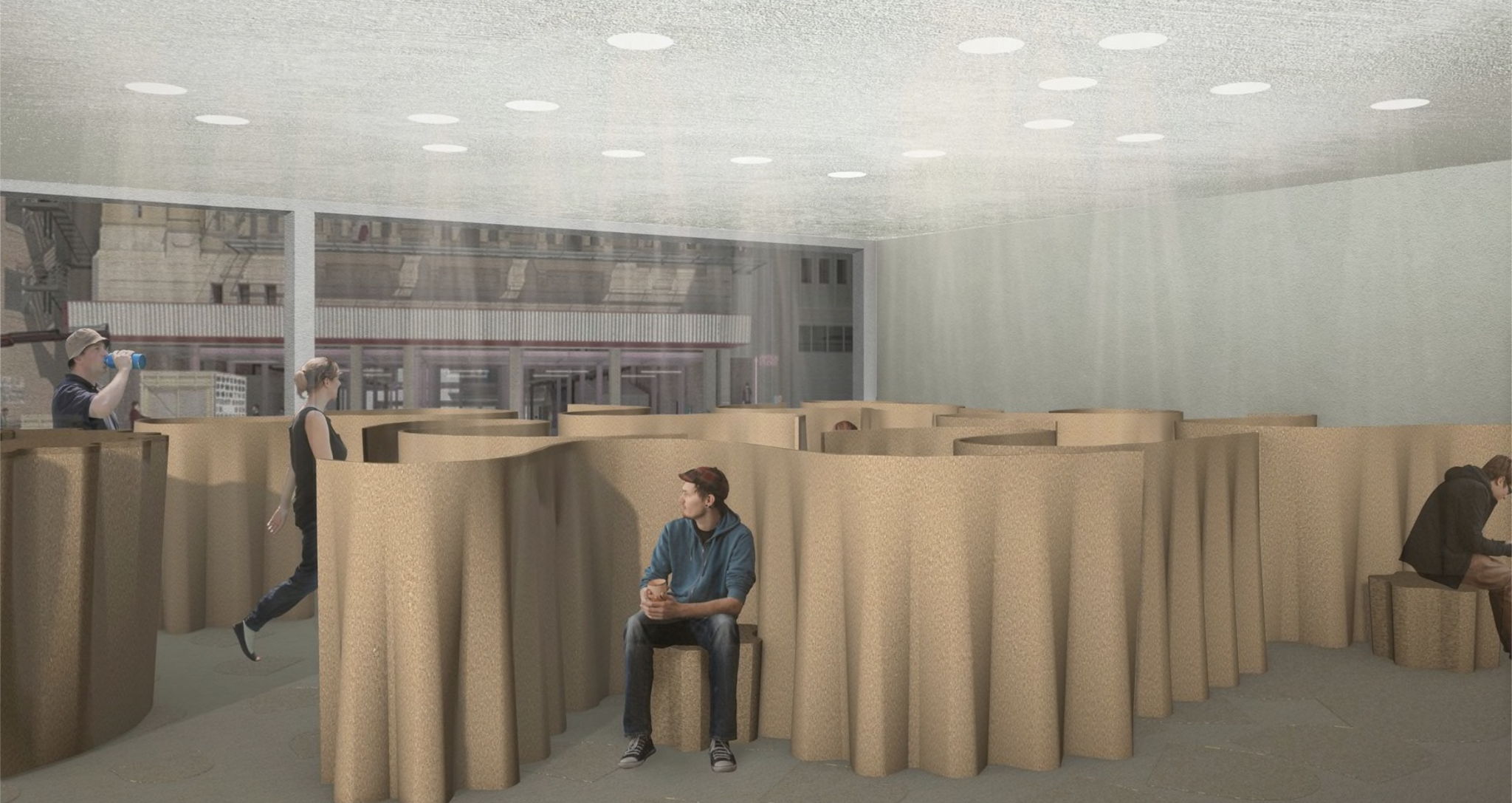 In 'Grassland' people are free to hide in freestanding flexible cork-rubber partitions. Roaming between them is not easy, the deeper you go, the more undisturbed you get. When you choose a stool, wrap the partition around it by magnetic grain, you can enjoy disconnect and remain in solitude for a period. -