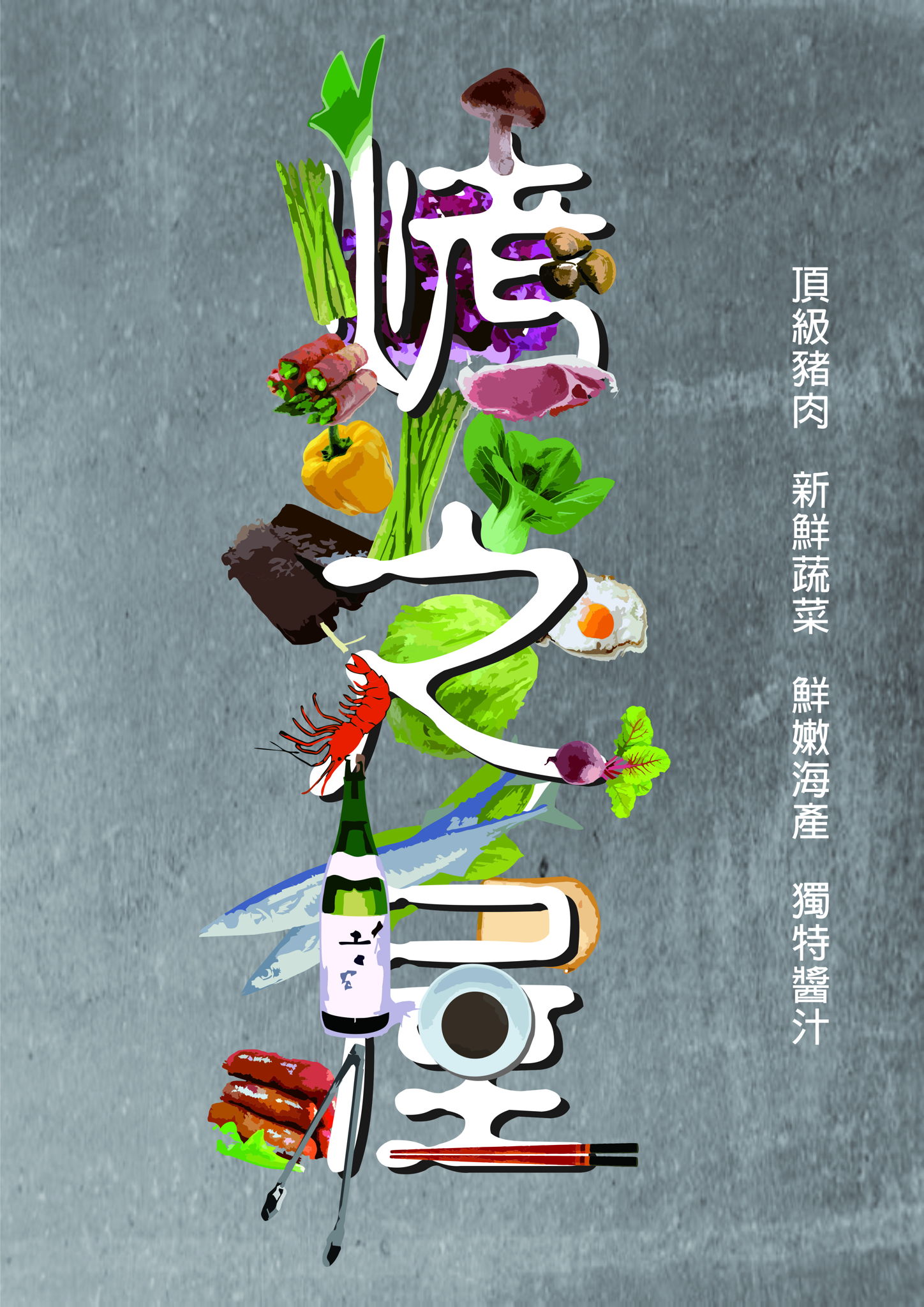 此海報以形象化的方式表示,將烤肉時常見的食材放入結合字體,直接將店裡有的食材表現出來,底圖以灰色刷面呈現出一種日式石頭烤肉的感覺,整體偏向日式風格。