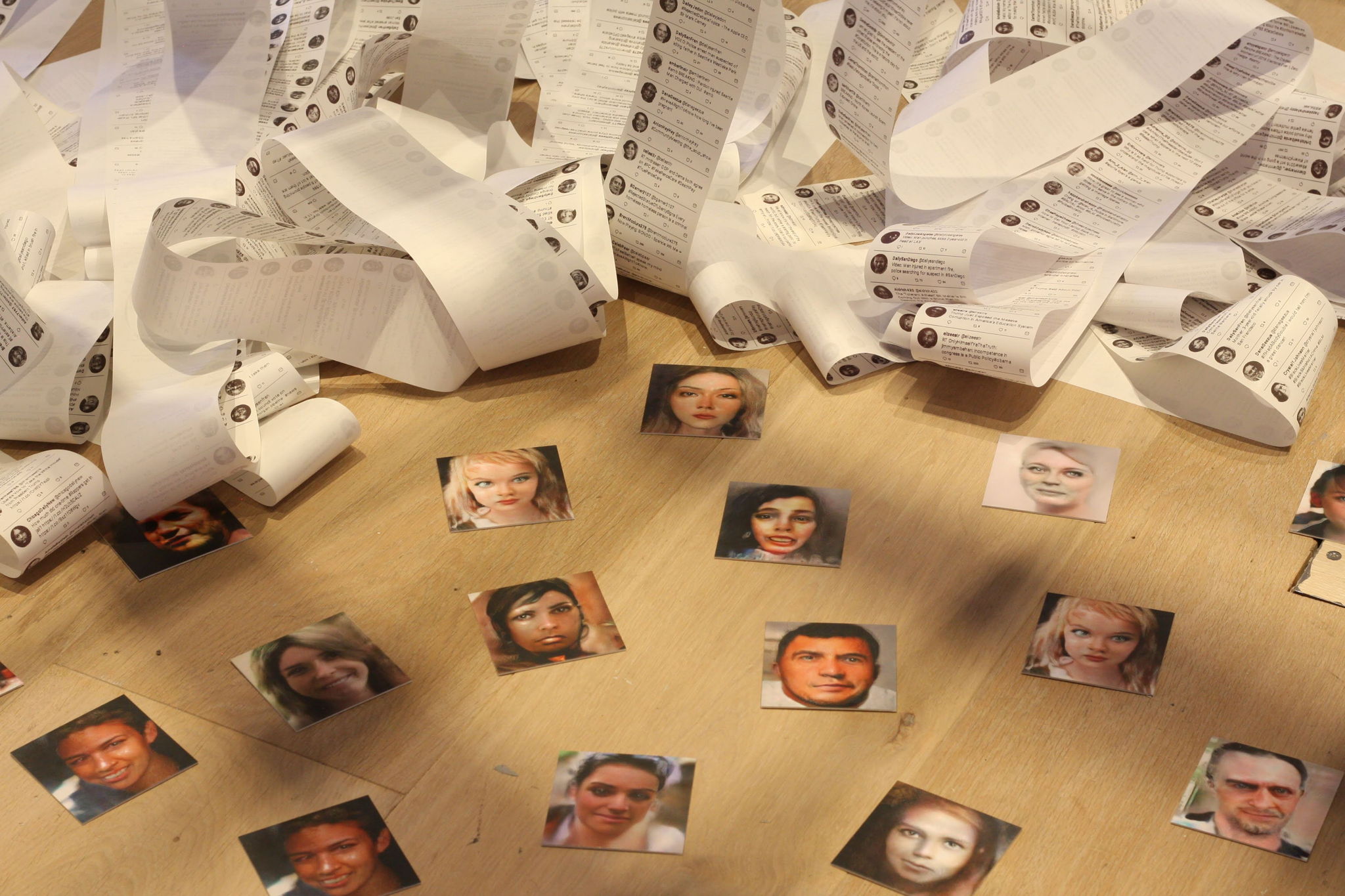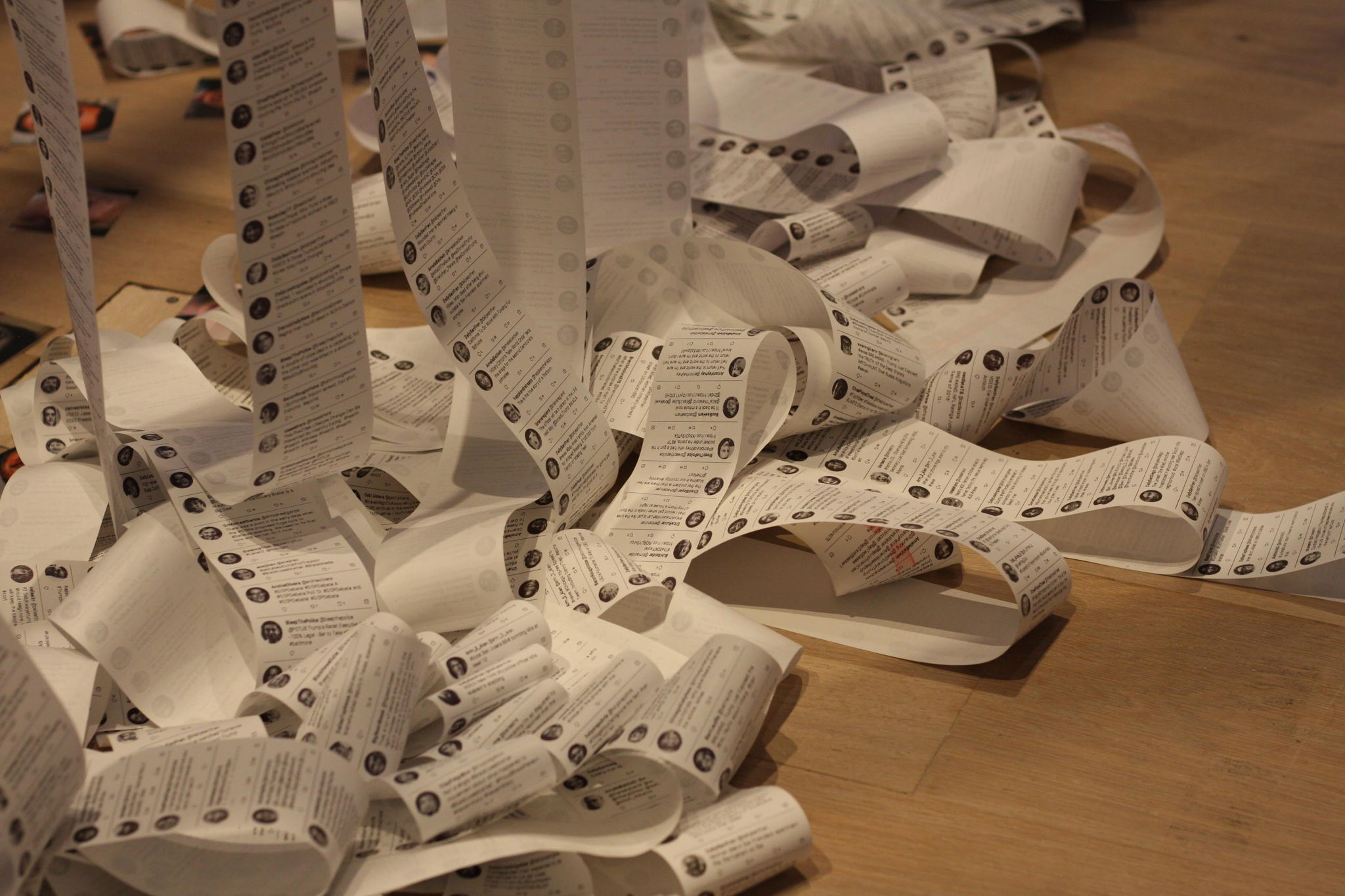 The 20 thermal receipt printers are live and continuously printing AI generated tweets at a slow but steady pace, letting this sculpture evolve and change every day. Ultimately the paper torrent overwhelms and buries the central space and chairs, unless we keep clearing the space. -
