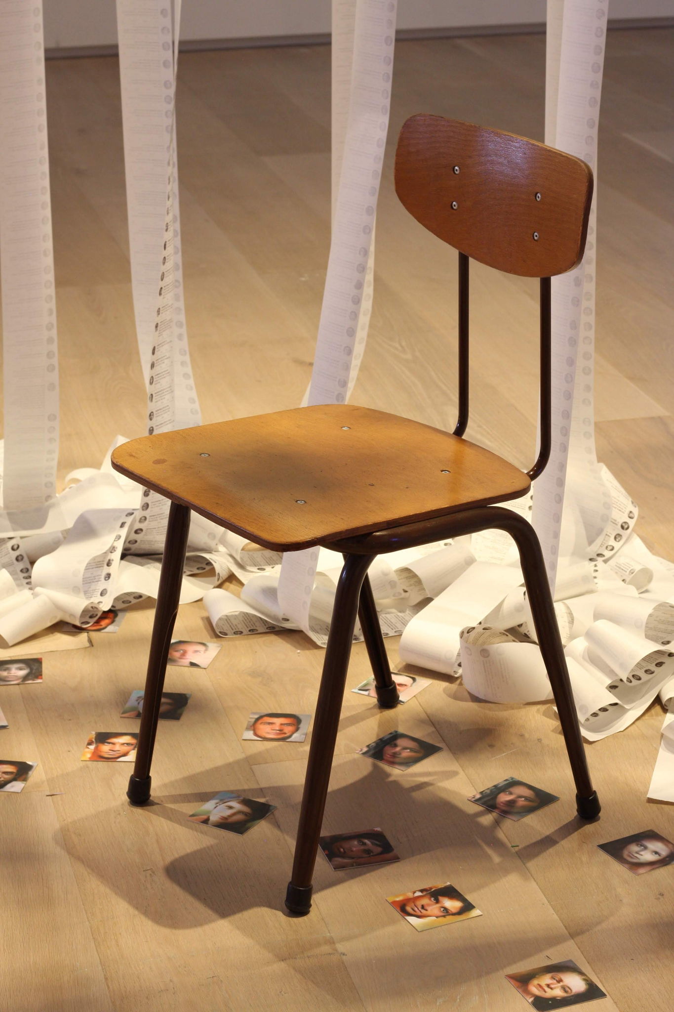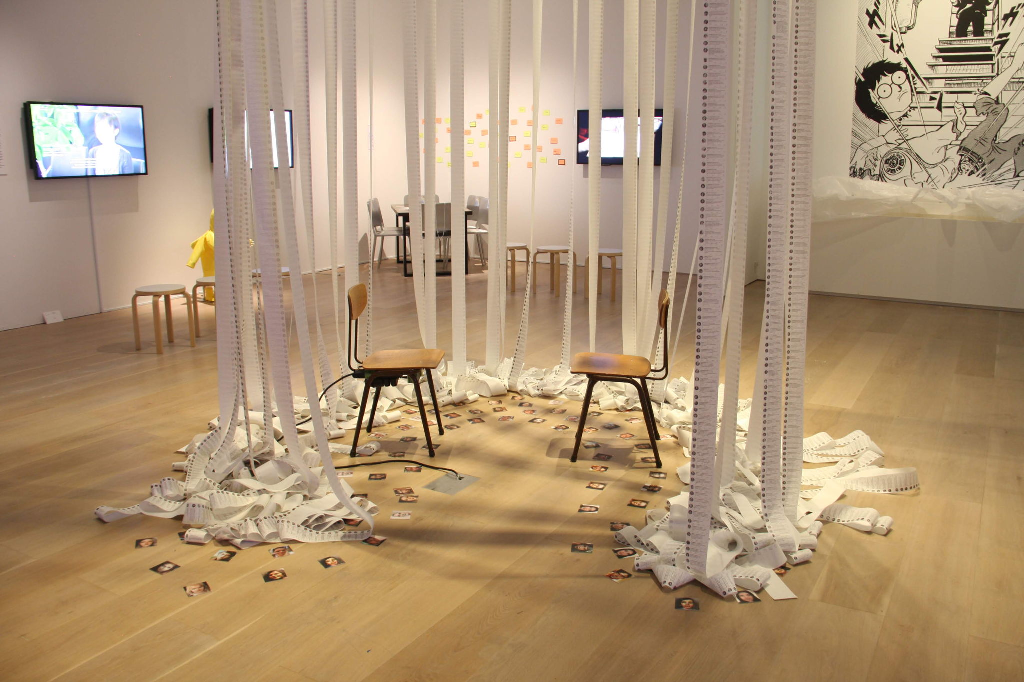 Materials: 20 Receipt Printers and paper rolls, AI Language Model, AI Image Generator, Chairs