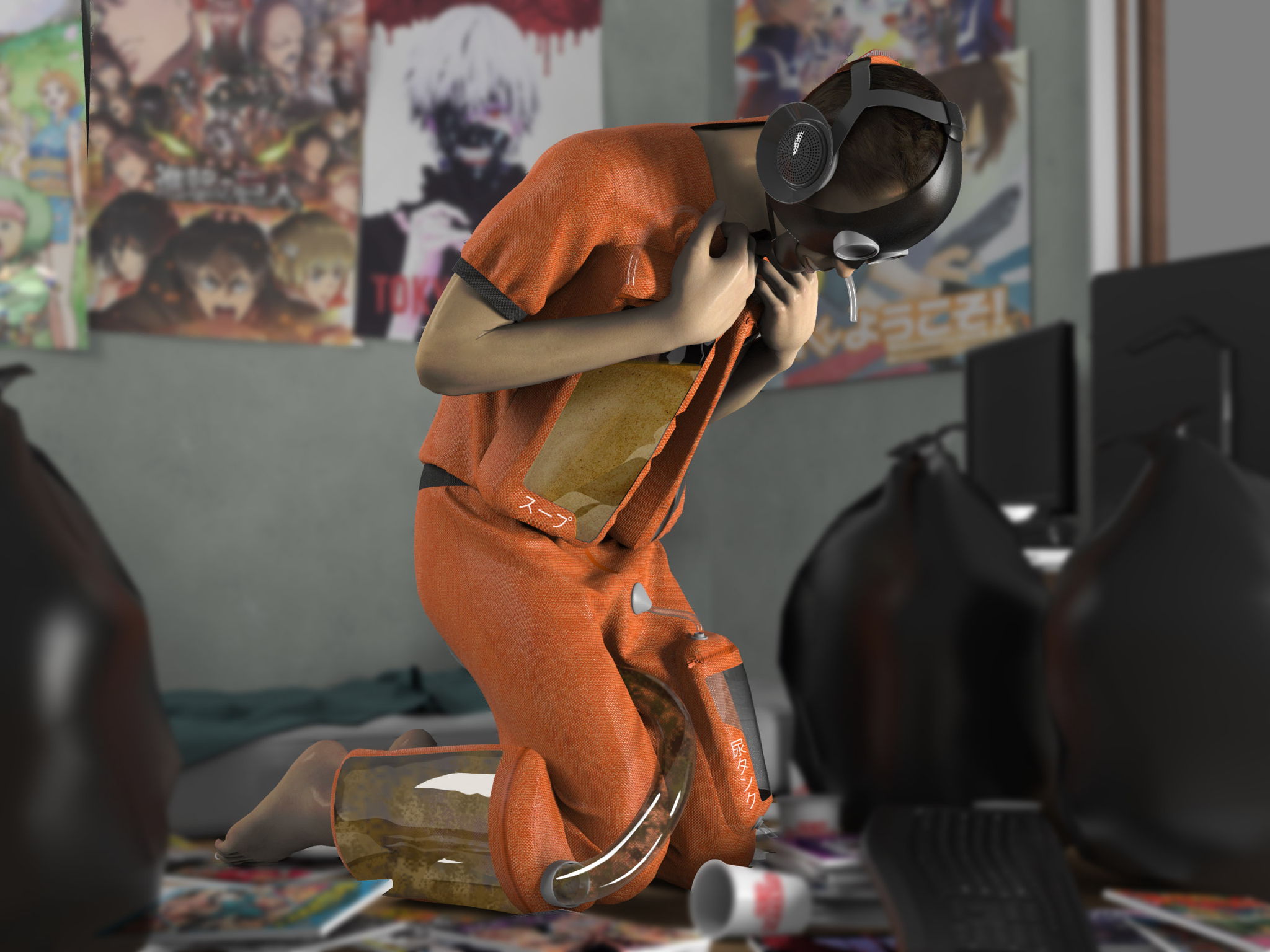 The suit exaggerates a hikikomori's lifestyle and eliminates distractions to provide an uncomfortable experience that brings out the absurdity of their choices.