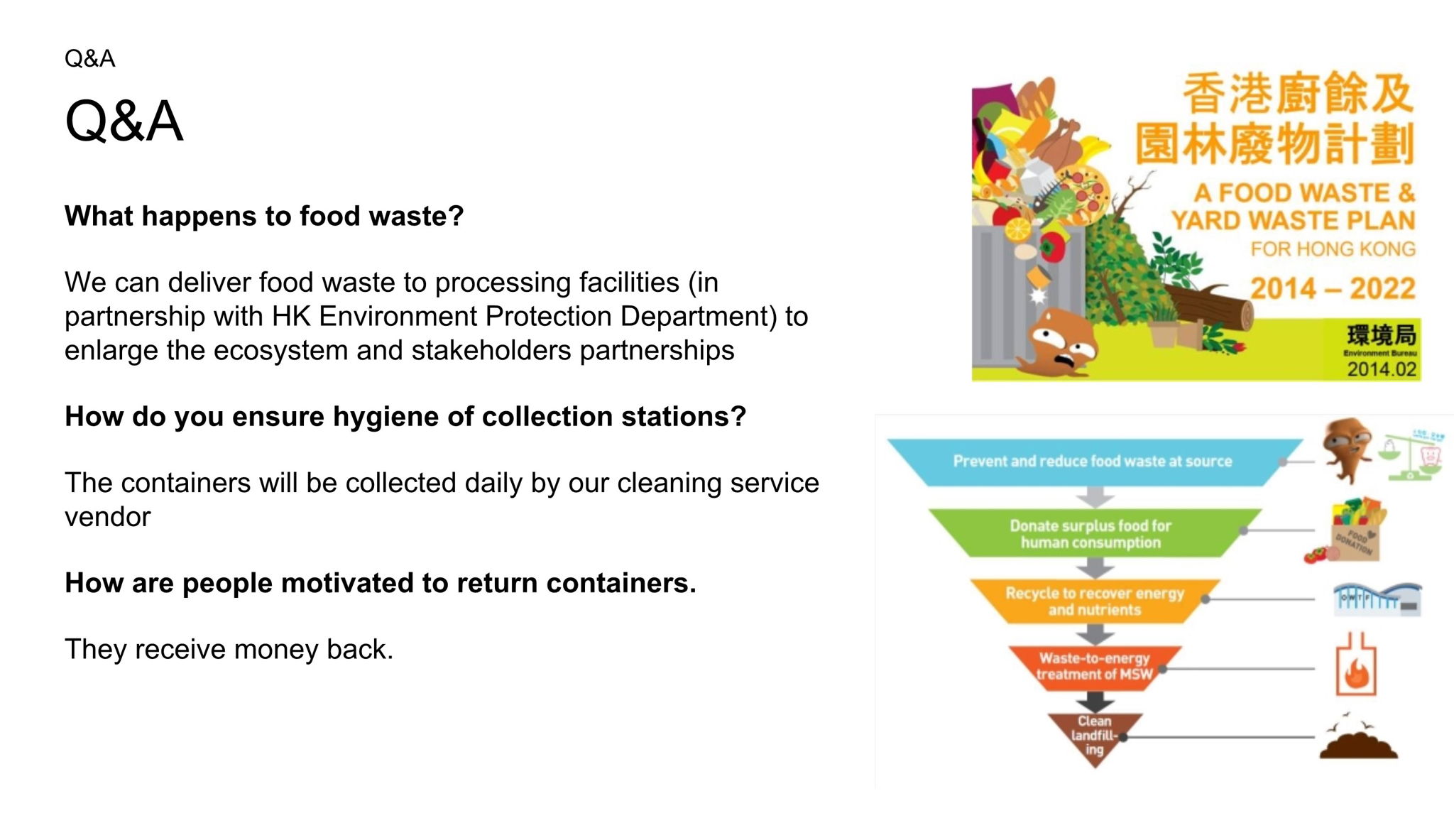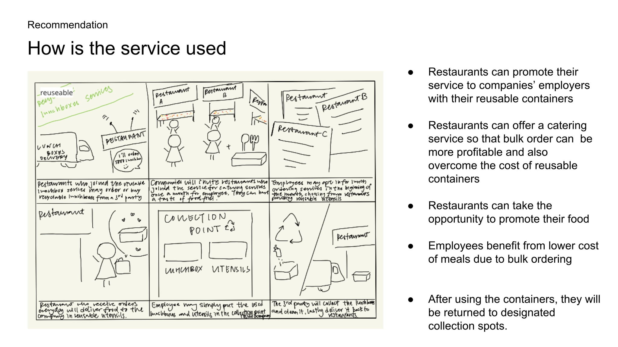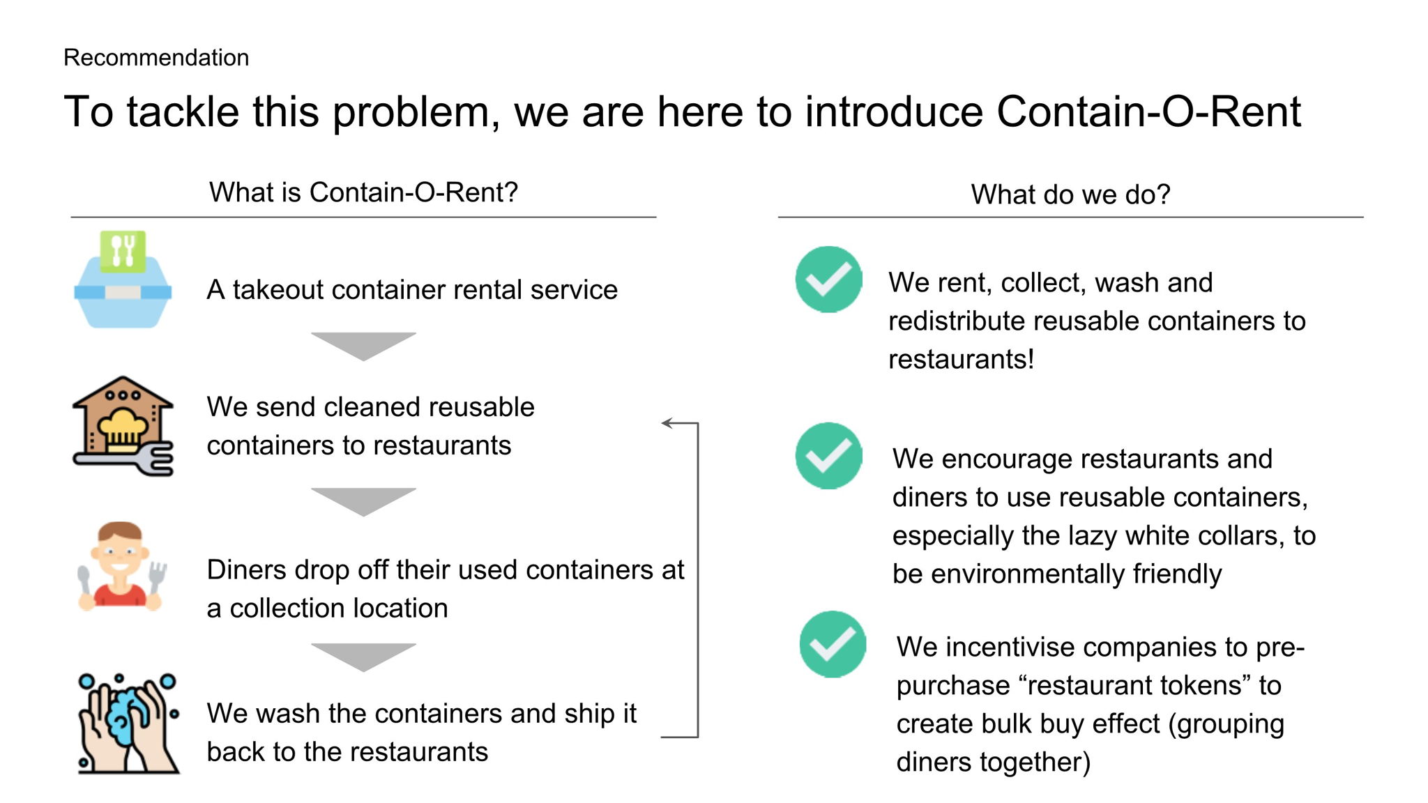 A takeout container rental service. We send cleaned reusable containers to Restaurants. We have convenient access collection points for used containers. We clean and reuse them! It's green and convenient!