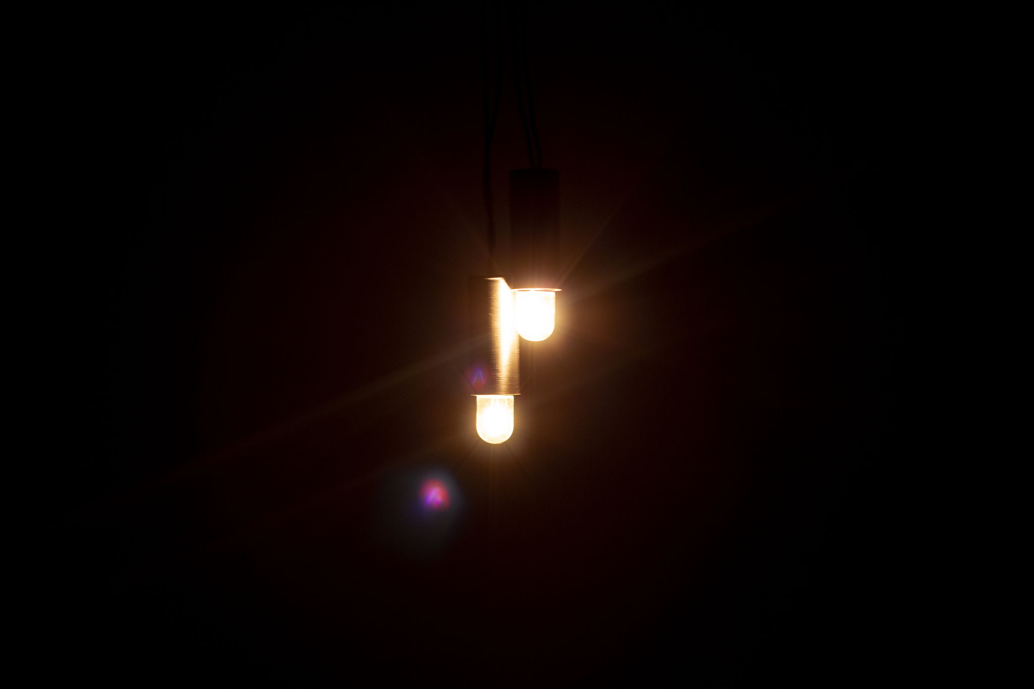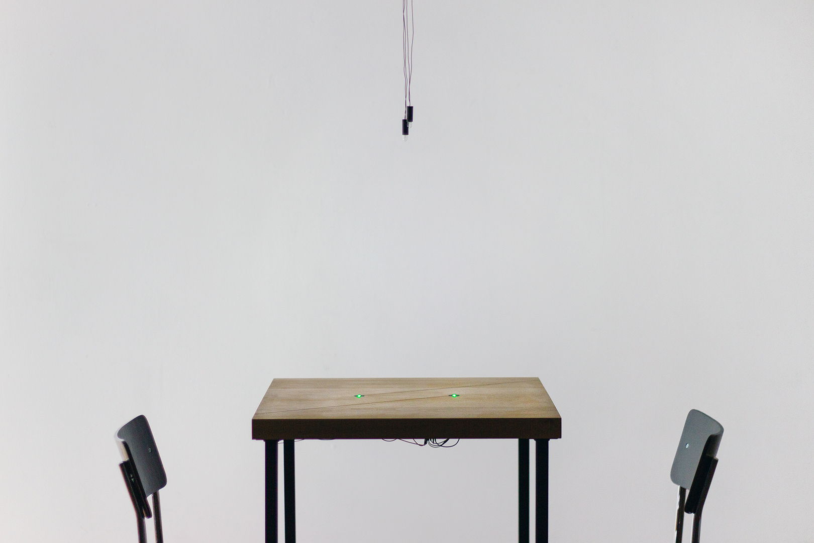 Bodytalk translates the heartbeat of two bodies into synchronous light signals. The installation has a mirrored setting of sensors and seating, arranging two individuals to sit in front of each other, with glowing light bulbs in between.