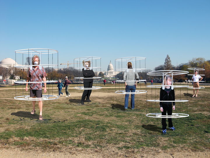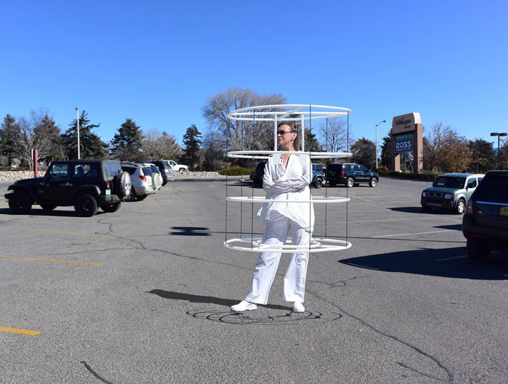 In light of the Coronavirus and the need for varying degrees of social isolation, I have created this series of fantasy photos that suggest how we may be living in the near future, in an attempt to distance ourselves safely from one another. Although somewhat tongue in cheek, some version of my proposal may in fact have a certain degree of inherent practicality. These little structures I call Social Distancing Aids, would be made of lightweight plastic. They would be designed in the form of four large connected collapsible rings, placed over the wearers head and held in place with two vertical supports that rest on the users shoulders. A fifth smaller ring is connected at the center to the perimeter of the lower large ring. This ring helps to hold the entire assemblage in place side to side around the wearer’s legs.