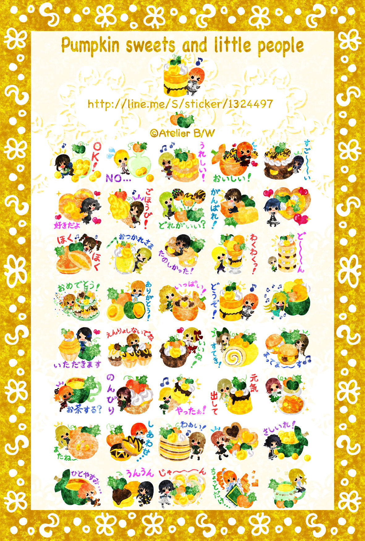 美味しいかぼちゃのスイーツと可愛い小人達のスタンプです。家族や友達、恋人達とほっこりしましょう。