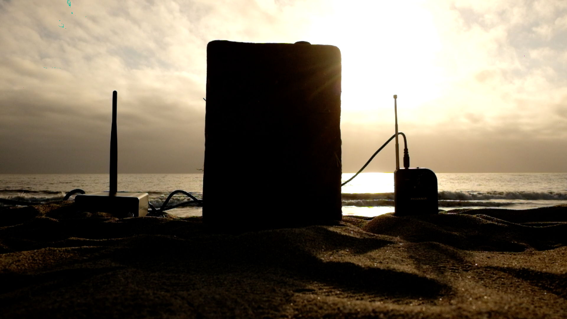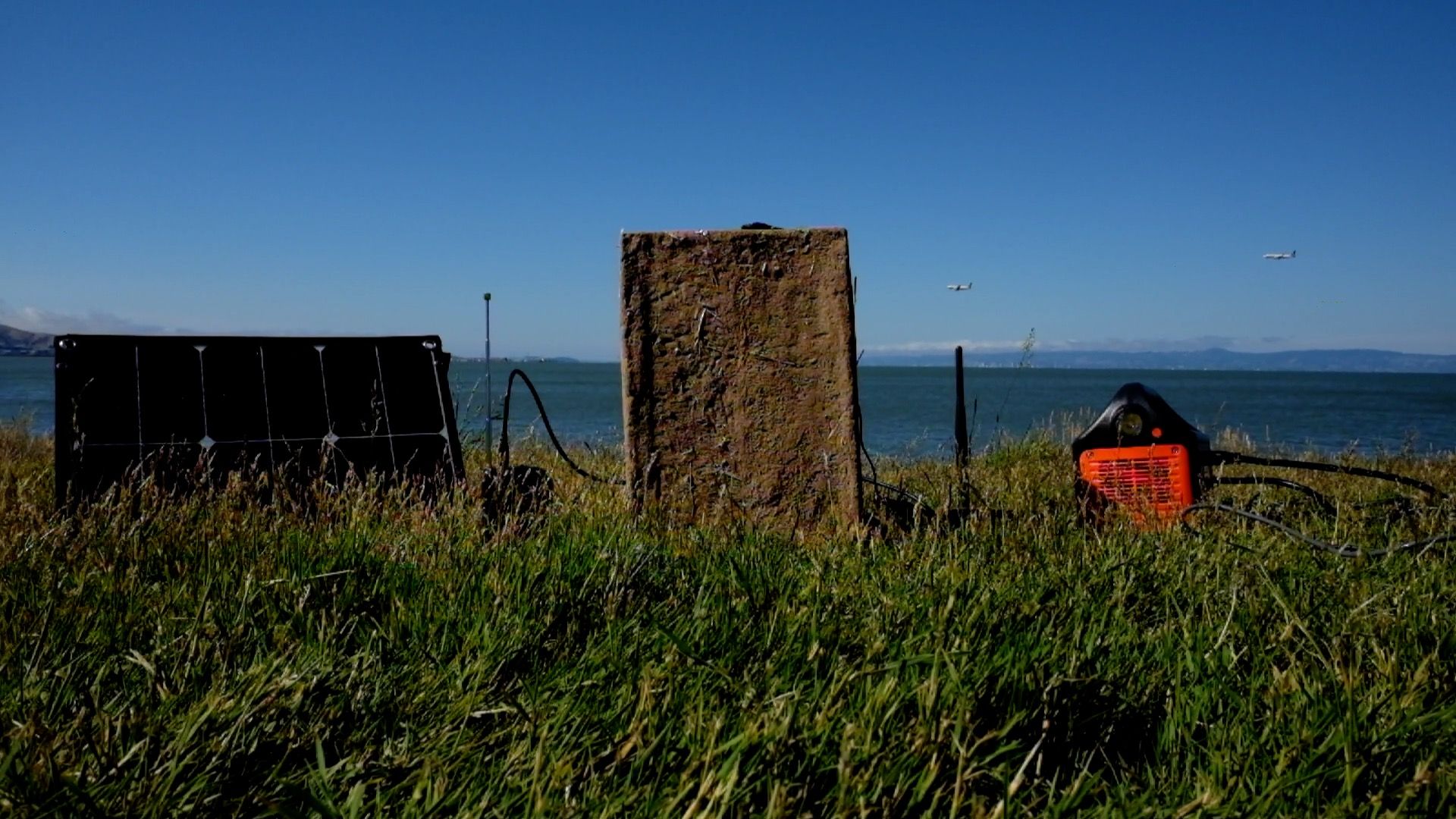 For this piece, titled Returnal, I documented three of these bricks across the San Francisco Bay Area, each connected with a contact microphone to a radio transmitter. Three repeating videos reveal currents of static humming from the adobe, the transmission waves slowly ebbing and flowing. The earth’s raw material and the broadcasted sound’s immaterial quality merge, pulsing through space and time, forming a circuit of return.