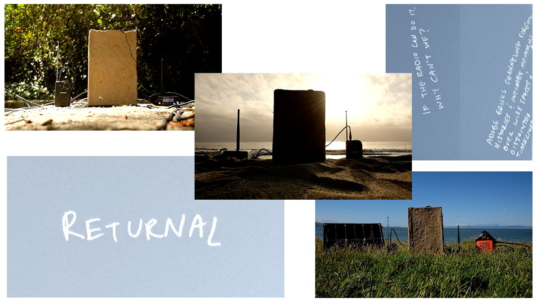 Returnal was created by Santino Gonzales using three handmade adobe bricks, a radio transmitter, a solar powered generator, a pocket radio, and a contact microphone. The installation covers about 4ft x 3ft of space on the earth.