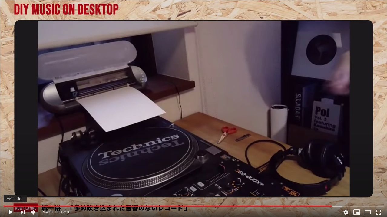 In the performance, a waveform drawn as a vector image on a computer screen is engraved as a groove directly on the surface of the paper by a cutting plotter to generate sounds of arbitrary frequencies without recording on a common record player.