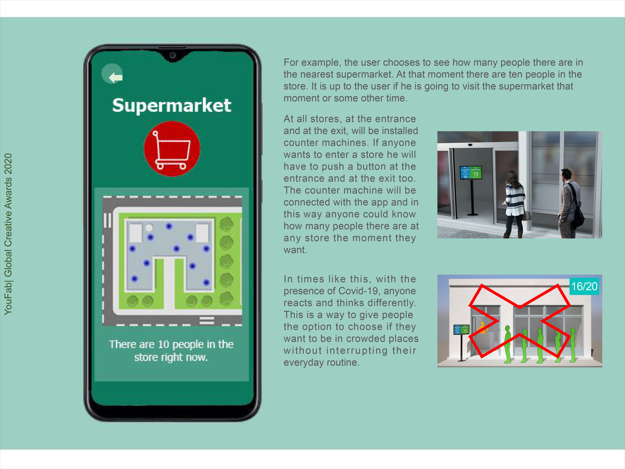 The theme of the competition was "contactless". So I came up with the idea of an App that anyone could know at any time how many people there are at the nearest stores.The concept is to give people the opportunity to choose if they want to be in crowded places without interrupting their everyday routine.