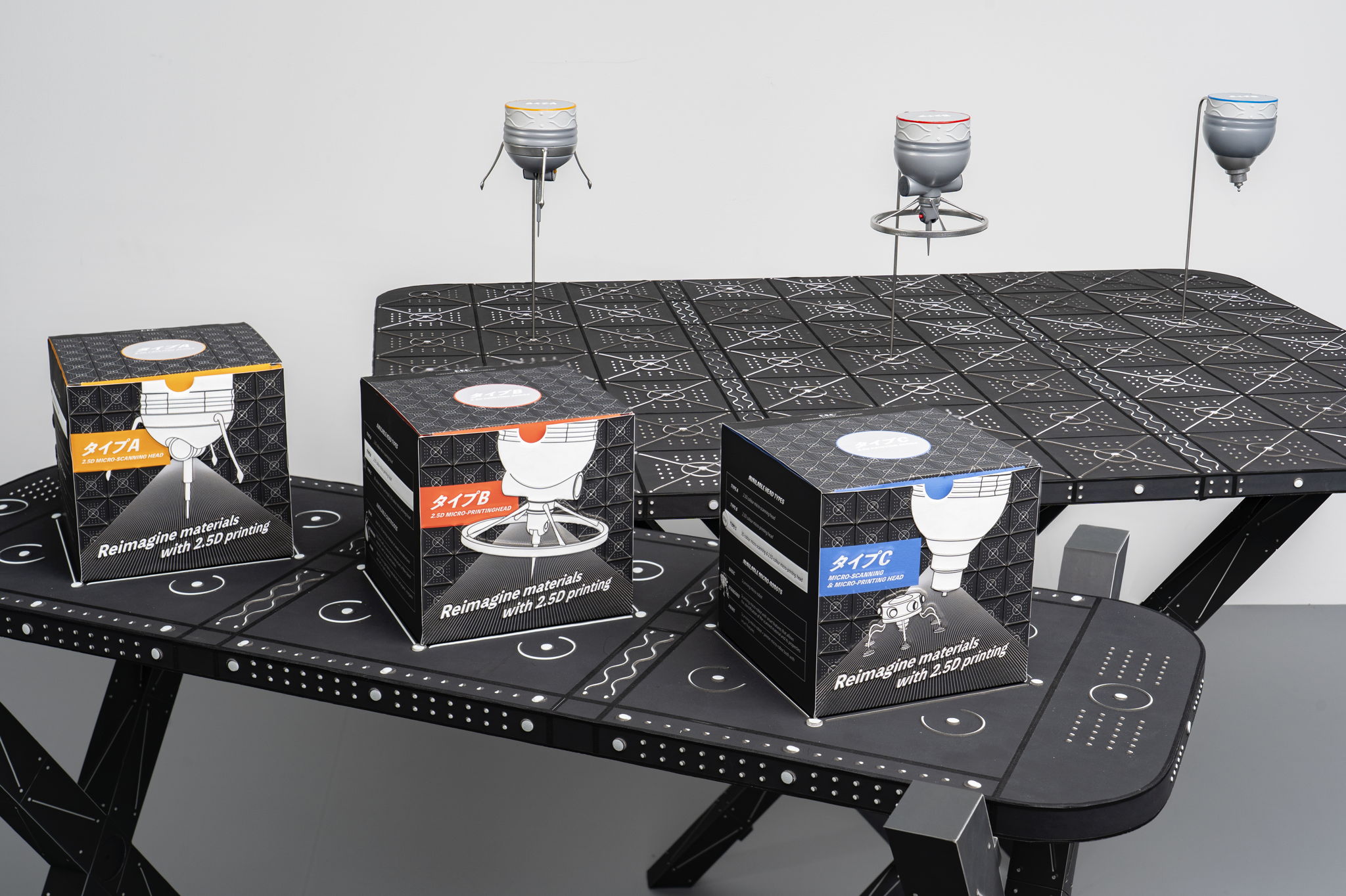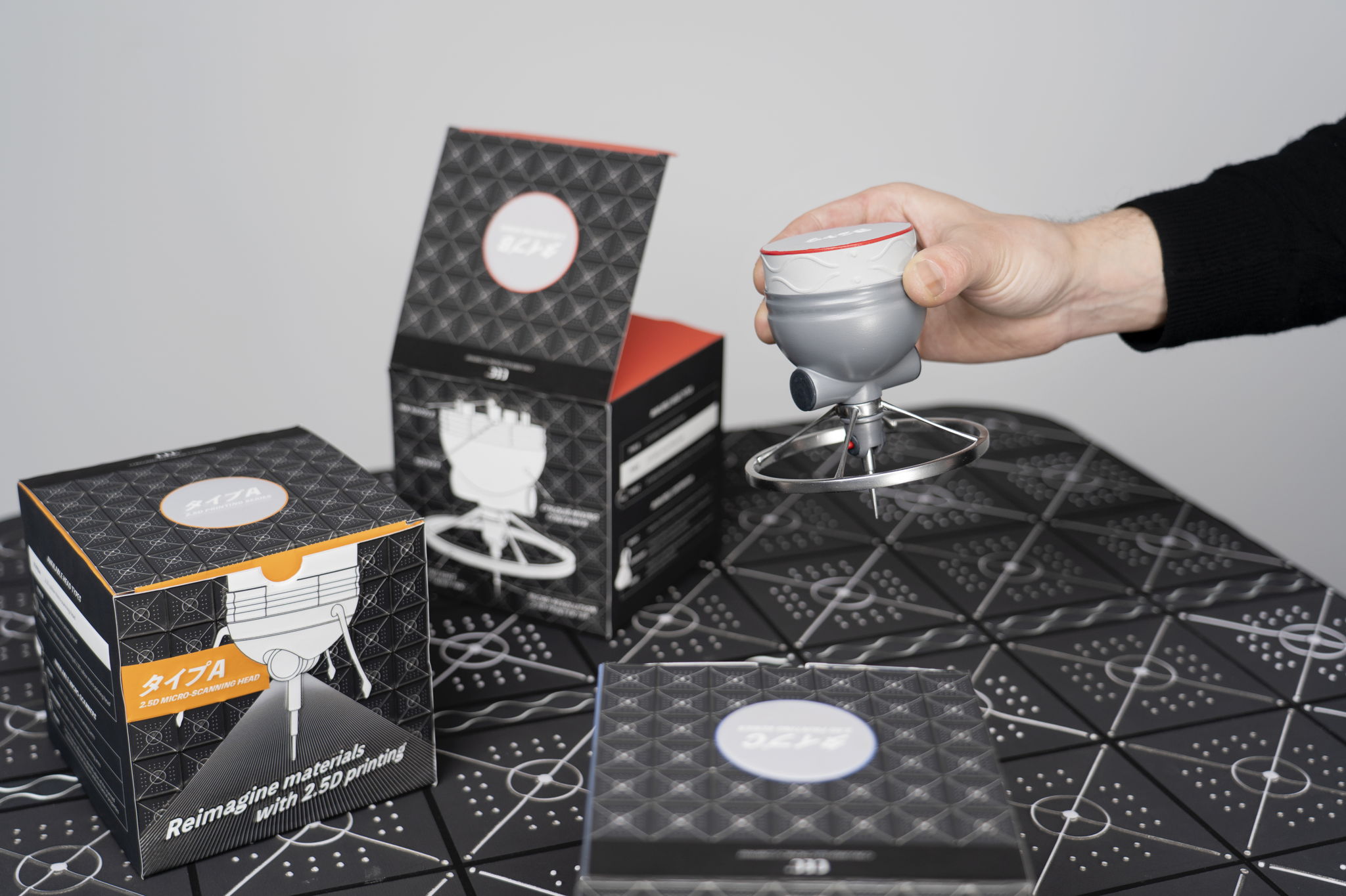 Fictional 2.5D Printer being shown together with the packaging of the 3 fictional devices produced for this project
