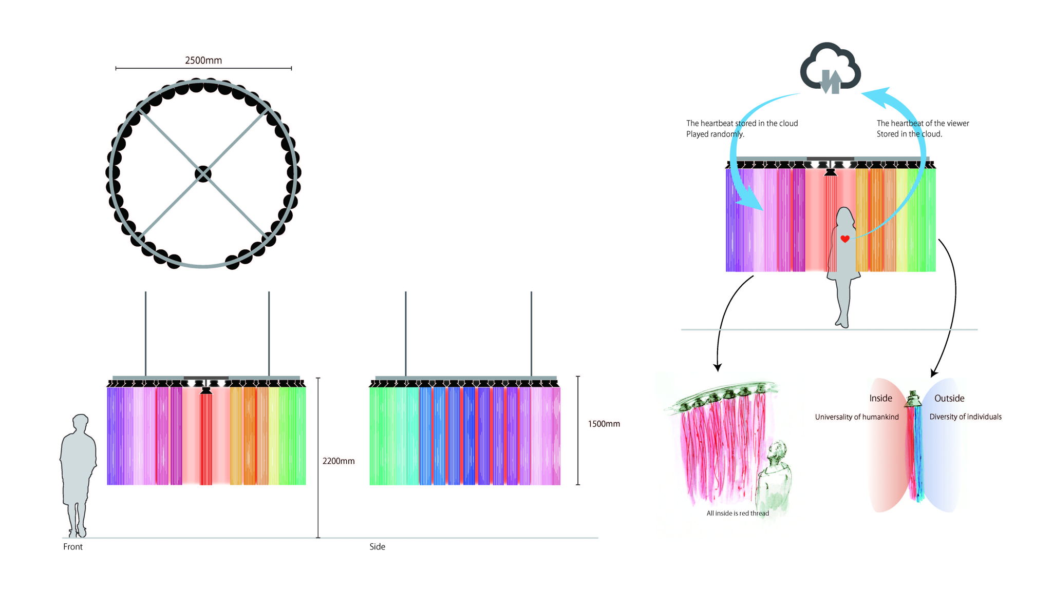 これは、全ての人の為の作品です。私達が誰もが持つ鼓動は人間生命そのものです。また、鼓動は誰一人として同じリズムを刻むものはなく、私達はみな違った同じものを持ち合わせています。自己と他者の鼓動を可視・触覚化することにより、私達が根源的に持っている「差異と同一」「多様性と普遍性」を体感する装置となる。また普段見たり、聞いたりすることのない、私達内部の生命現象に直接触れる機会は、コンタクトレスがデフォルトになった社会で、深く他者に触れ、理解する体験を創出する。そして、クラウドに人間の身体性を保持さることにより、仮想と現実の二つの世界にフィジカルを共有し、現在の私達を取り巻く世界を表現する。