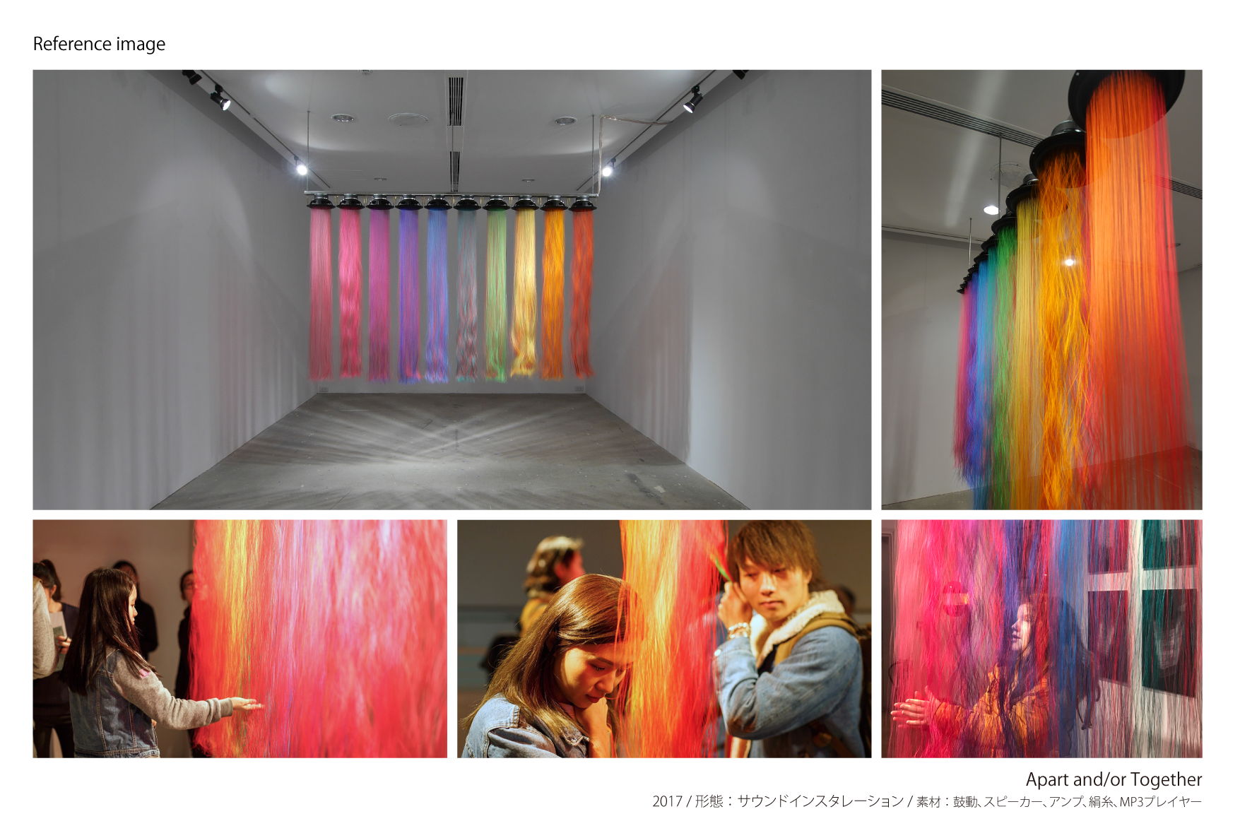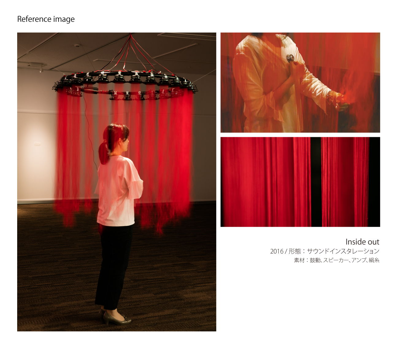This work consists of multiple speakers arranged in a circular frame with a diameter of 2.5 m and an independent speaker in the center. Innumerable threads are attached to all speakers, and the reproduced heartbeat is made visible and tactile by the threads.