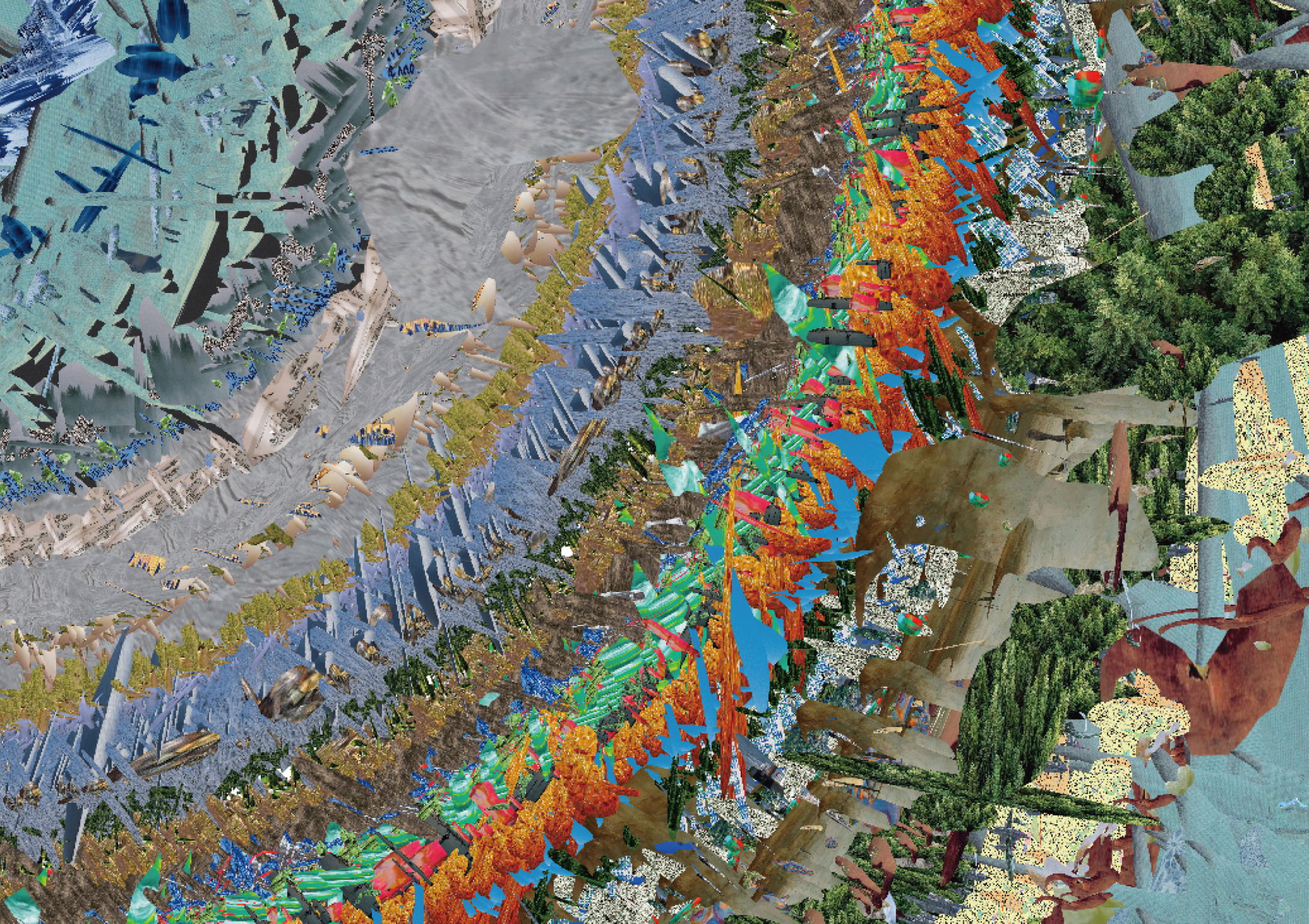 “River’s Edge” is the title of a series of collage artworks created from images obtained via the Internet through the medium of generative programming. In this series of images, the artist used a keyword associated with his childhood memory “River’s End” to conduct an in-depth search for and gather associated images, which he then assembled into vivid and visually appealing collages. In the “River’s Edge” artwork, blue, gray, and green sections of the collected images were associated with water, stone, and sky. Pieces from hundreds of images were extracted from the Internet in data form, processed, and emplaced in the images. The creative process was based on an algorithm that examined the collected images, extracted appealing sections, subjected them to a limited set of modifications, and then emplaced them into the artwork. Although the algorithm’s functionalities are limited to magnification, rotation, and choosing the areas to extract from the collected imagery, the process made it possible to create a wide variety of collages. In the numerous trials that were conducted to develop this art form, several new expressions were identified, and many beautiful patterns were created.