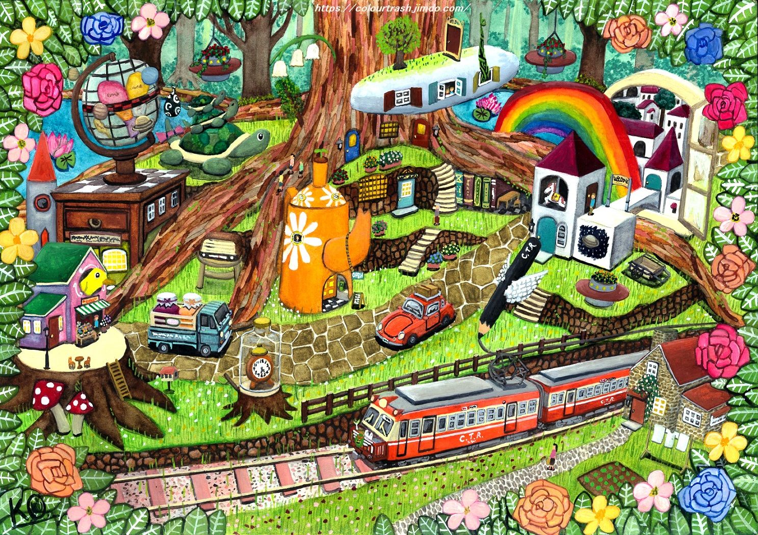 ...実は、展示のテーマが決定する前に既に下書きが完成してしまっていた状態で、(「愛と宇宙」と言うテーマを知った)その後に「UFOのプランター」やアンティークショップ横の中古ロケット、右の建物の宇宙の落書き...と言ったモチーフを描き加えた、と言う経緯があります。(汗)