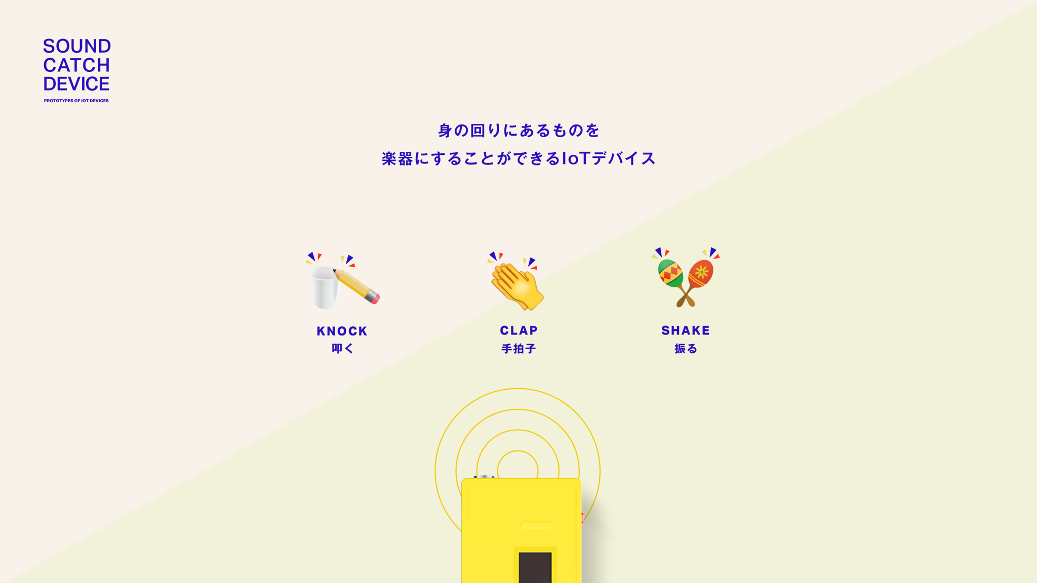 SOUND CATCH DEVICEは、音を『とる』ことで、身の回りにあるものをインターフェイス化するIoTデバイスのプロトタイプです。例えば、紙コップをペンで叩いたことや、ティッシュ箱に巻いた輪ゴムをはじいたことを検知します。また、Bluetoothやクラウドを介して通信する機能を備えているため、アプリやWebサイトと連携することができます。そしてそれは自分で工作したものと組み合わせて、電子楽器にしたり、ゲームのコントローラーにすることを可能にします。SOUND CATCH DEVICE自体はモデルごとに機能を割り得てたシンプルなインターフェースなので、ソフトウェアを開発することで、多様なコンテンツをうむことができます。