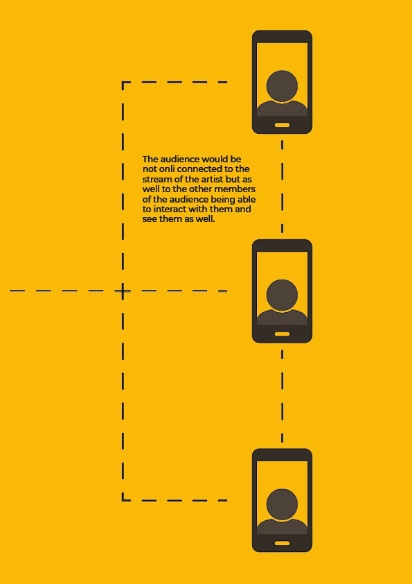 So the solution I propose is to actually bring the audience and the artist closer together by still doing the live perfomances online but enhancing this with the presence of the audience in the cameras, this way the artist could easily interact with them, making them sing along and seeing they’re reactions when they play a specific song. But we should not forget the part where the audience needs to interact with eachother, so why not create a separete chat within the live were the audience could talk with each other within the live without disturbing the artist.