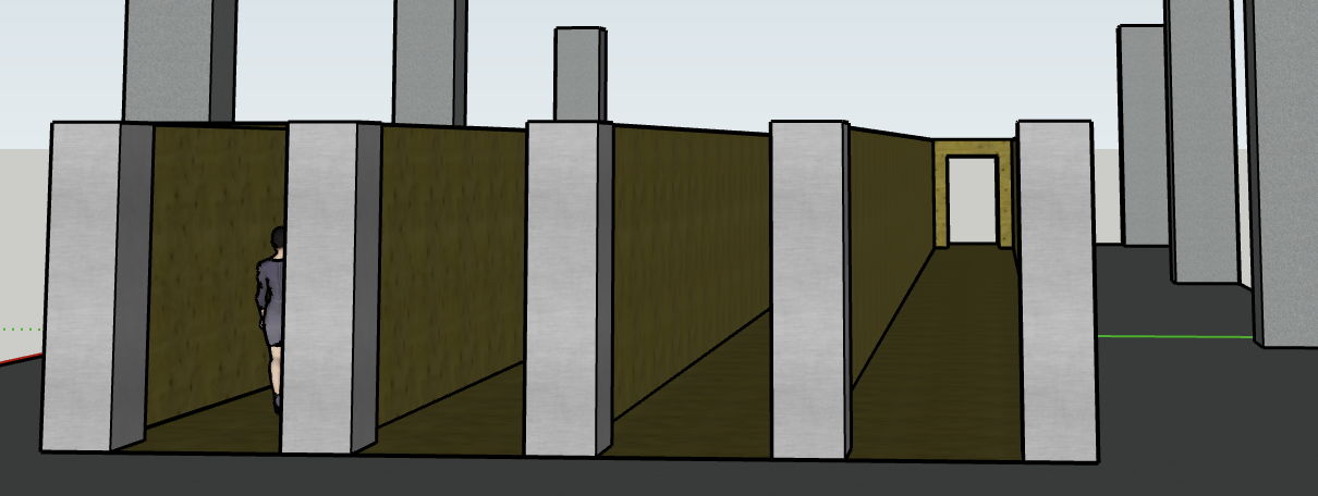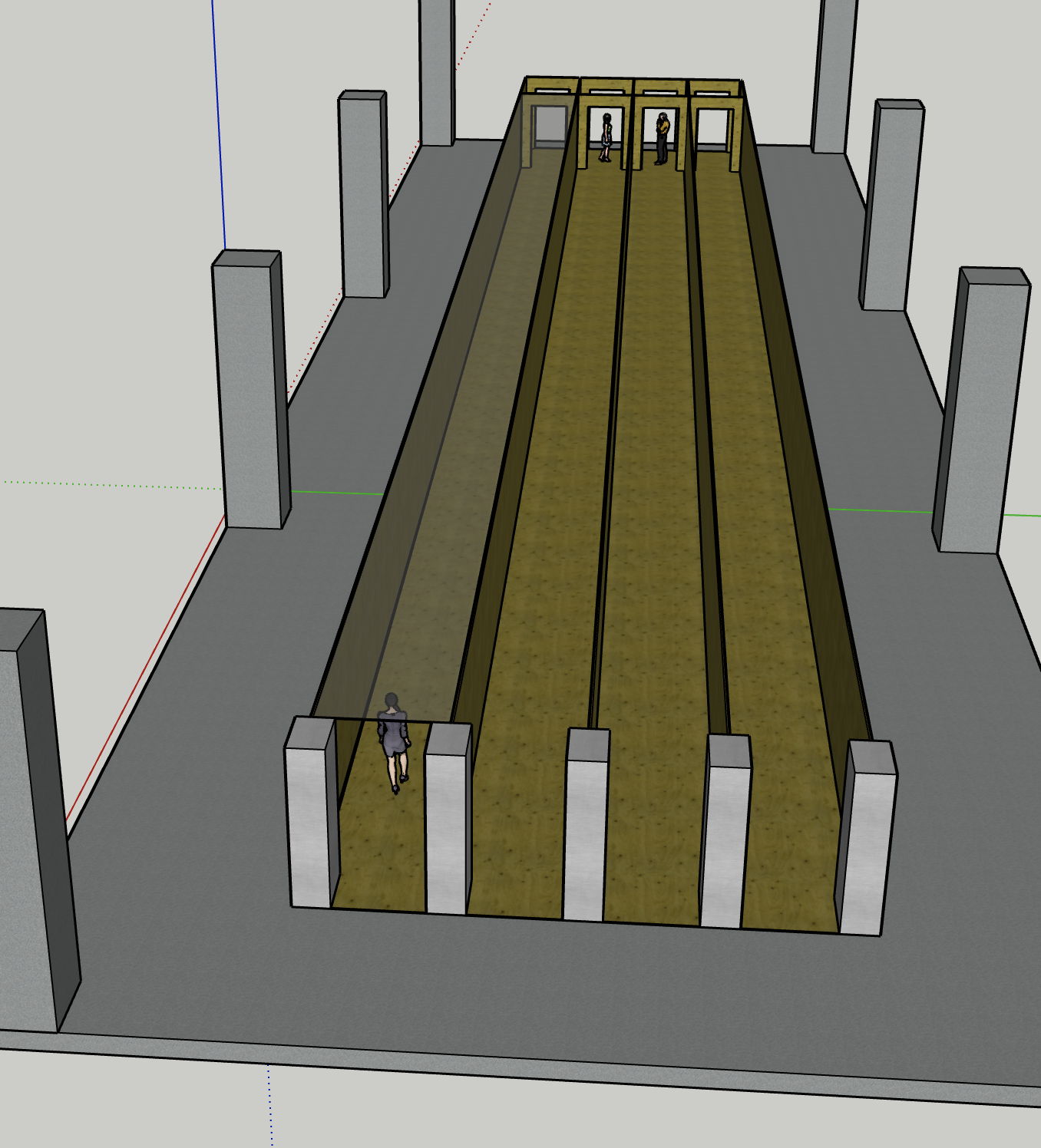The exhibition is constructed of plywood and plexiglass. The ideal location would be a large warehouse or gallery but could also be a pop-up exhibition in an open space such as a park. Bluetooth headsets are used along with projectors that are linked to code uploaded on Arduino boards and triggers.