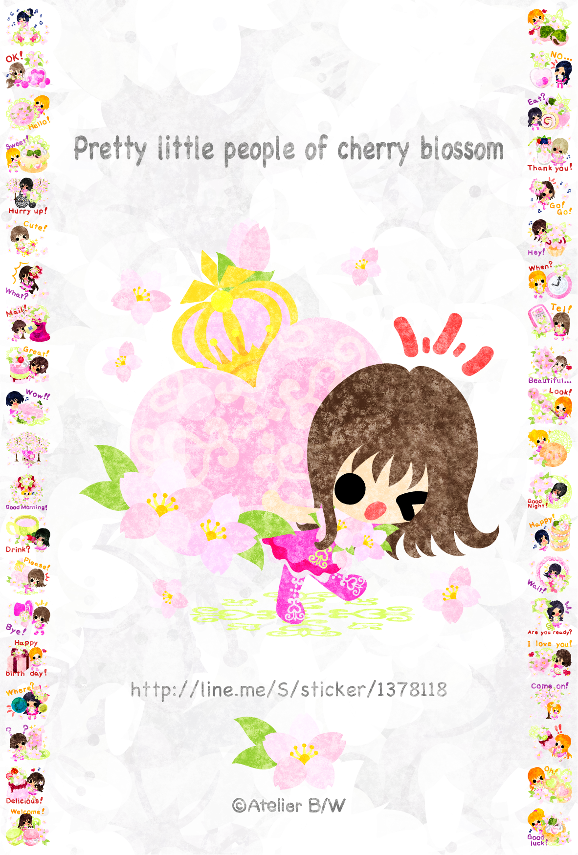 春と桜をテーマにした小さくて可愛い小人たちのLINEスタンプ(英名:Pretty little people of cherry blossom)を2/7に販売開始しました。日常会話を簡単な英語で表現しておりますので、外国の方にも使えます。