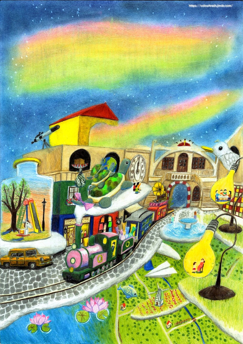 下部の街並みや列車は色鉛筆を使用しておりますが、(色鉛筆の箇所を)全て描き終えた後にパステルでオーロラや上空を描いております。