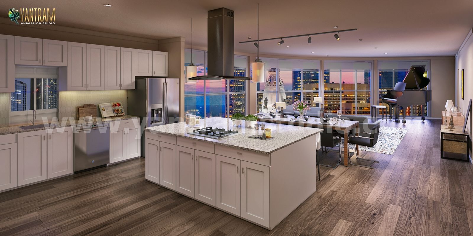 オープンコンセプトのキッチンリビングルーム3Dインテリアデザイナーのアイデア、キッチンとリビングルームを広々としたダイニングエリアのある機能的な集まりの場所に組み合わせるための省スペースのトリック-仕事、休憩、遊びに最適、アイランド付きのオープンコンセプトキッチン、木製の床、美しいペンダントライト と木製の家具、素晴らしいソファ、ティーテーブル、椅子、魅力的なフォトフレームのあるリビングルーム建築デザインスタジオによって開発されました
